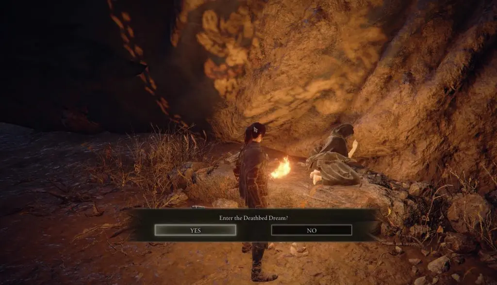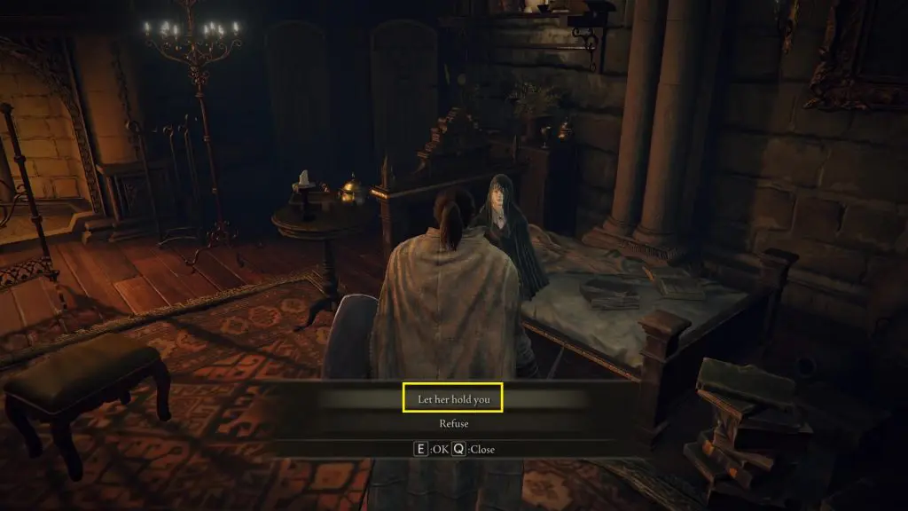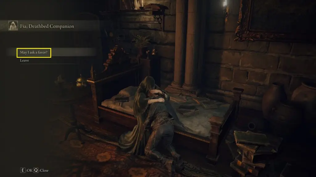 Come back after some time and talk to Fia again. Keep reloading the area until you find Fia asleep. Then enter the Deathbed Dream and defeat the boss. After the fight, collect Mending Rune of the Death-Prince from Fia’s body. Come back later to get Fia’s Robe and Fia’s Hood from her body.