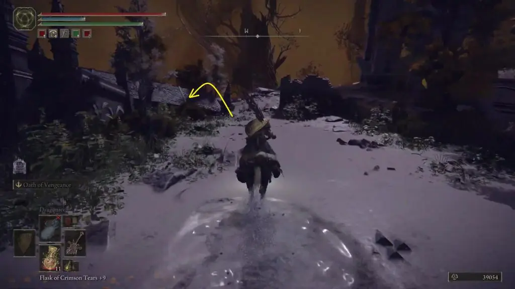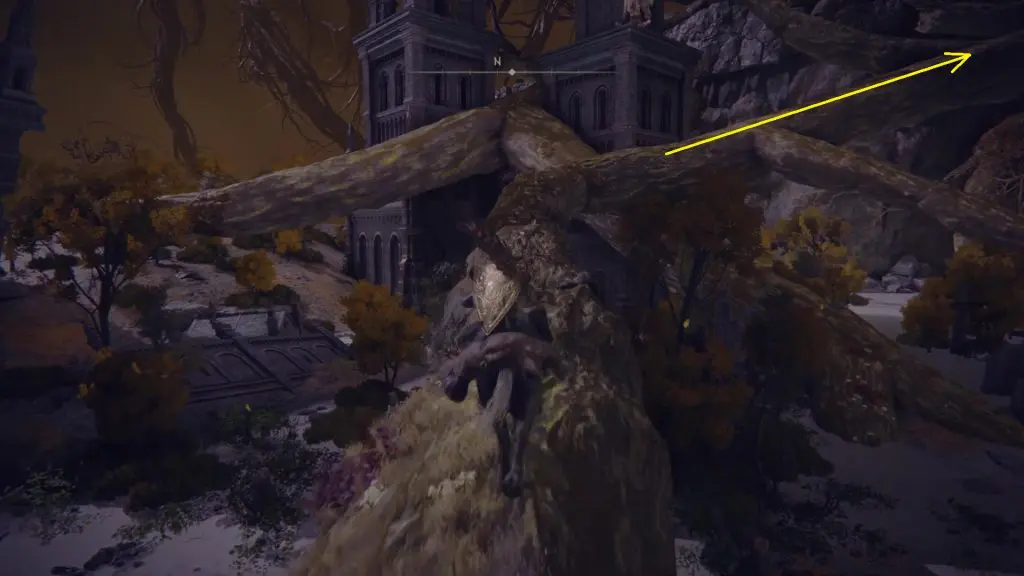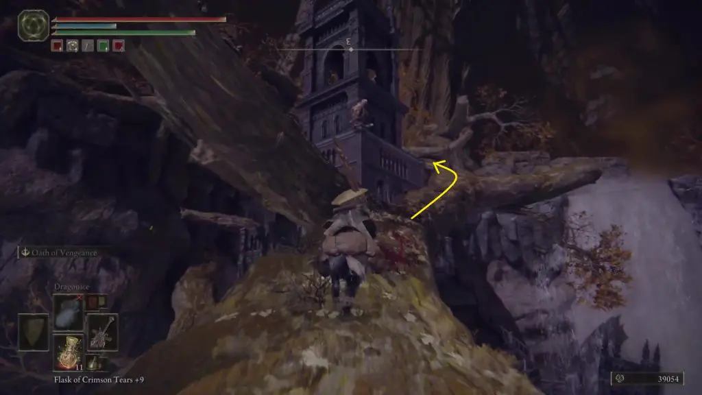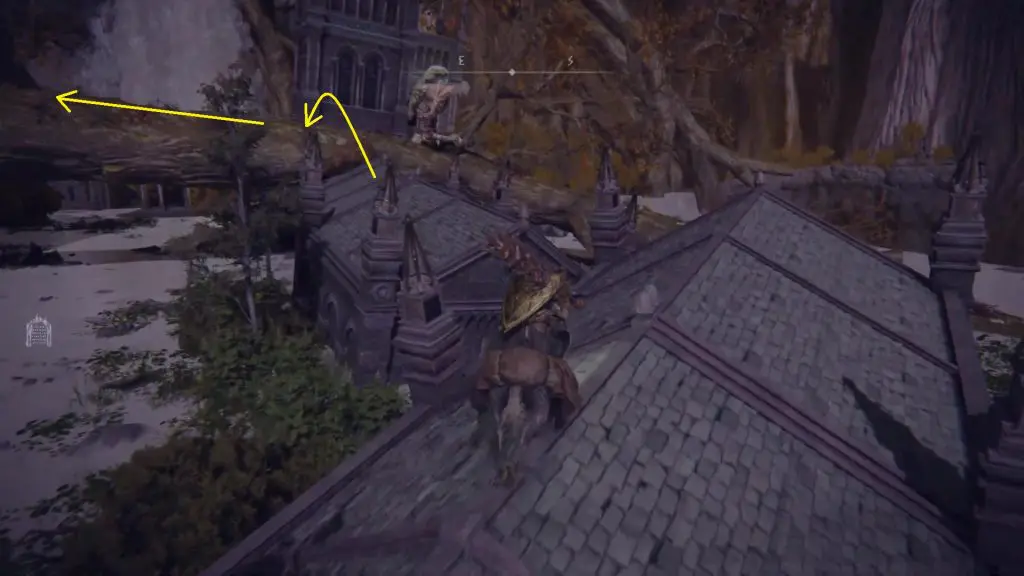 Go past this gazebo, and you will find a few ruined houses on the left side. Jump on the roof of the ruined houses to reach the tree root as shown in the pictures below.