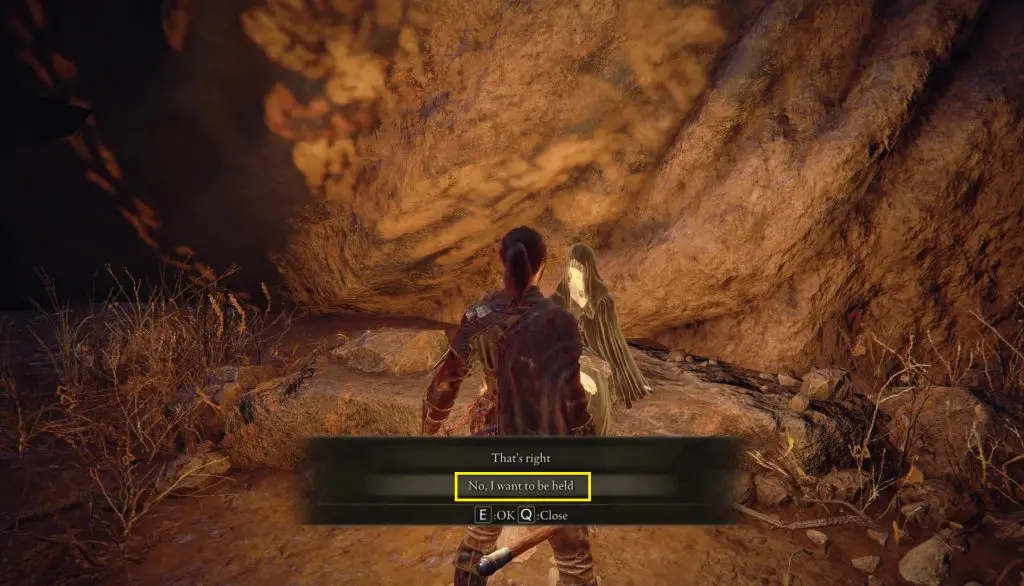 After defeating Fia’s Champion, talk to Fia, who will be sitting there. Choose the option, “No I want to be held”. She will ask you to find a Hallowbrand.