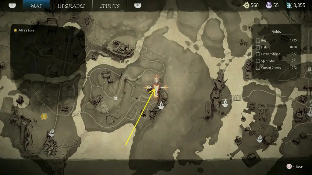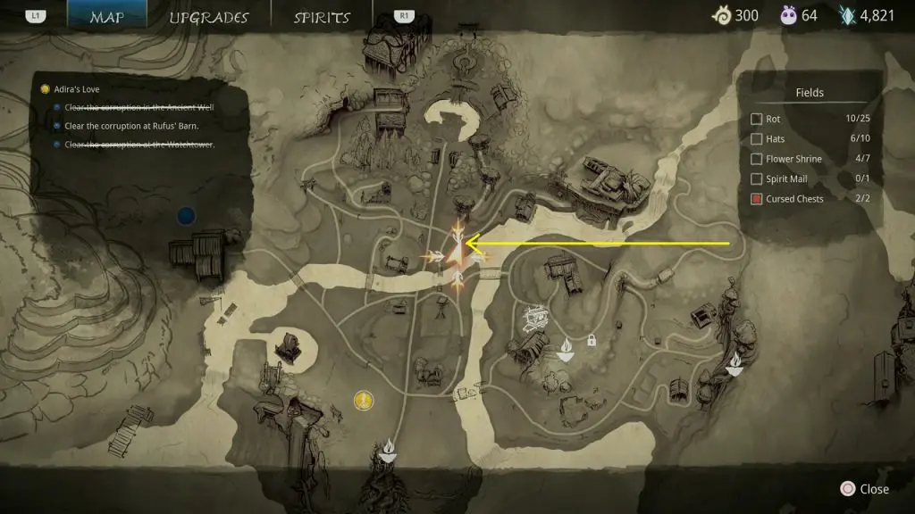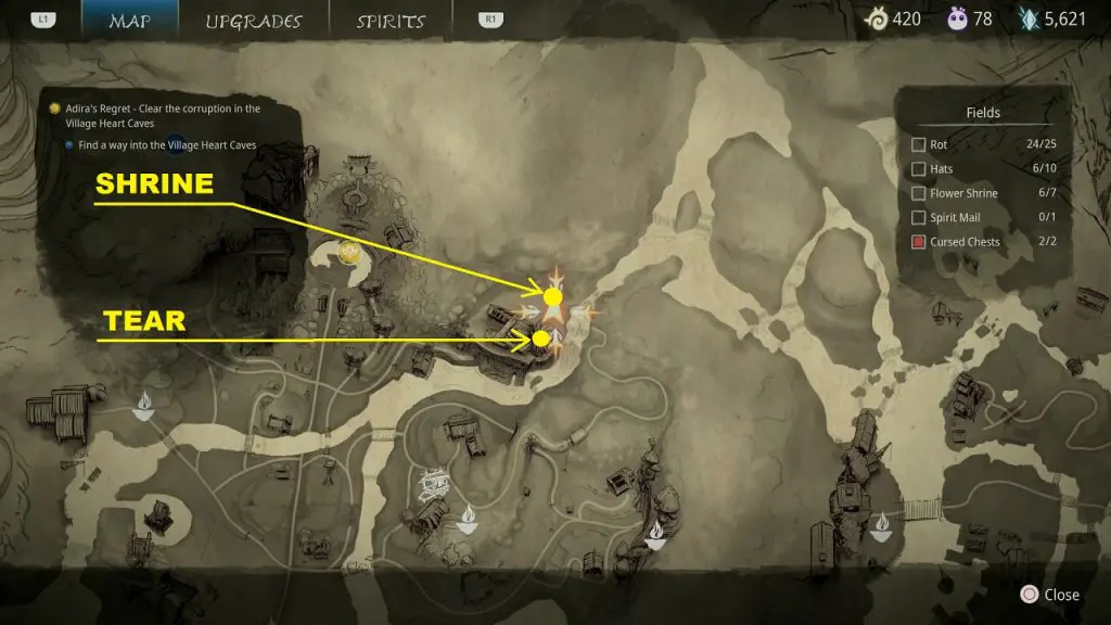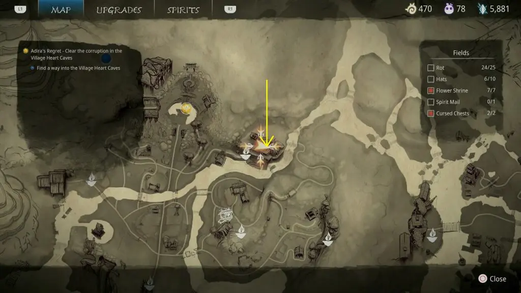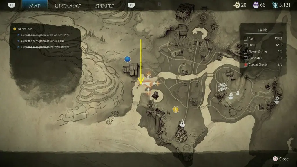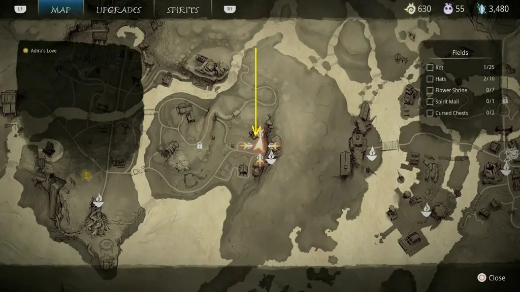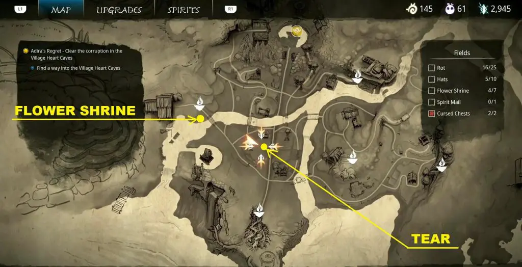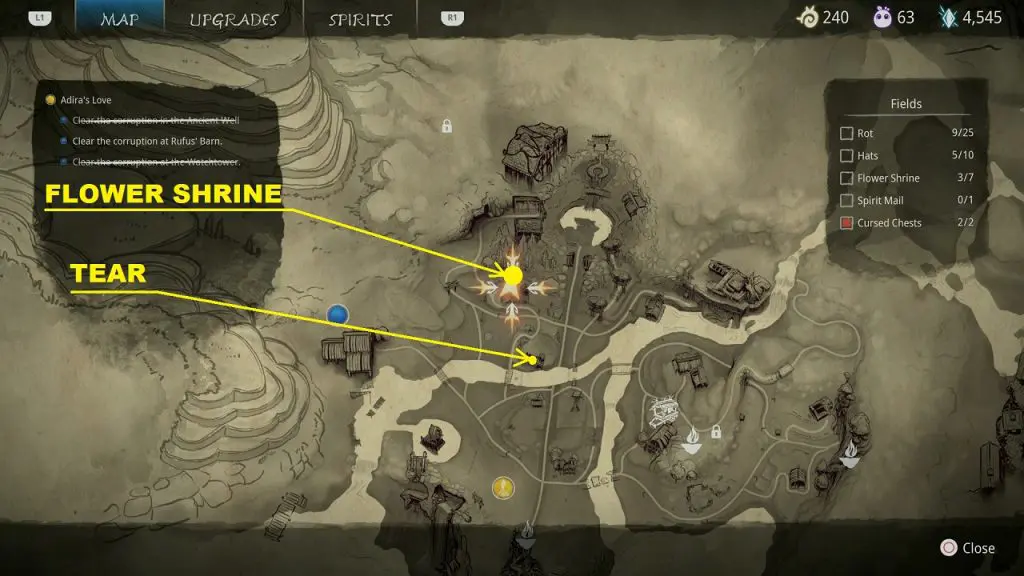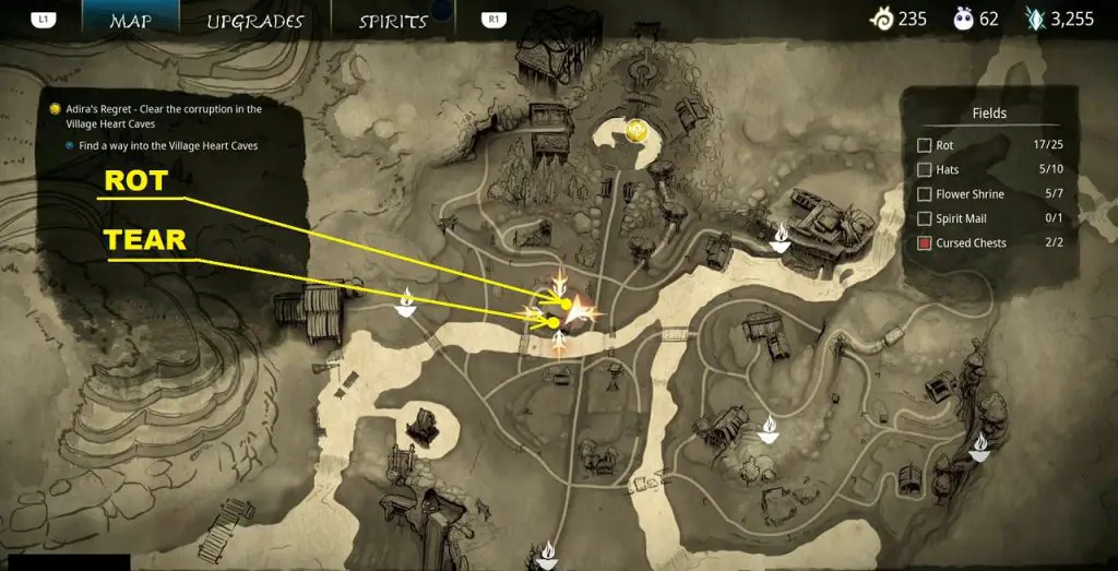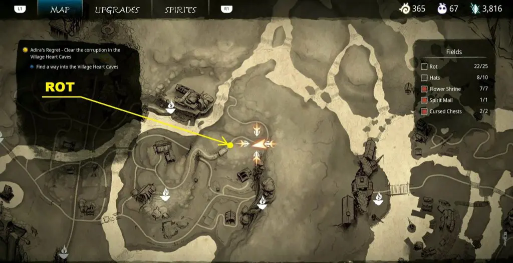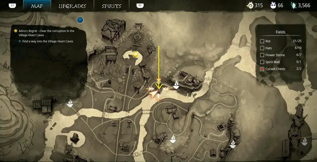 This guide shows how to get all the collectibles in the ‘Fields’ area in ‘Kena: Bridge of Spirits’. There are a total of 45 collectibles in the Village Heart (25 Rots, 10 Hats, 7 Flower Shrines, 1 Spirit Mail, 2 Cursed Chests).
