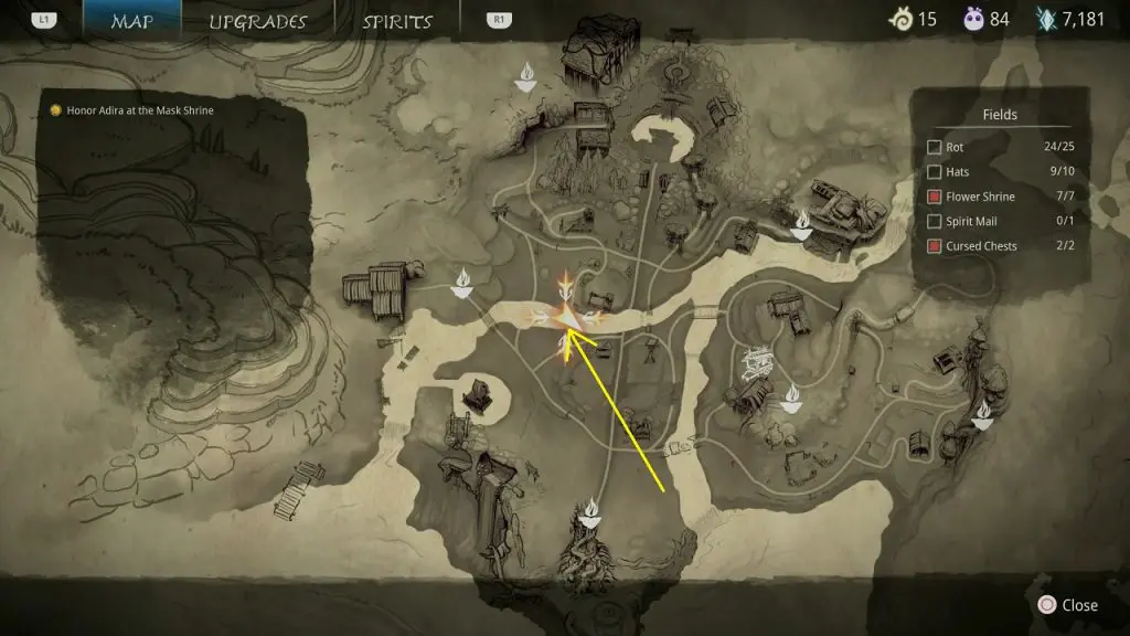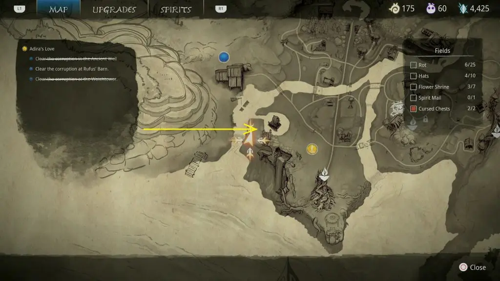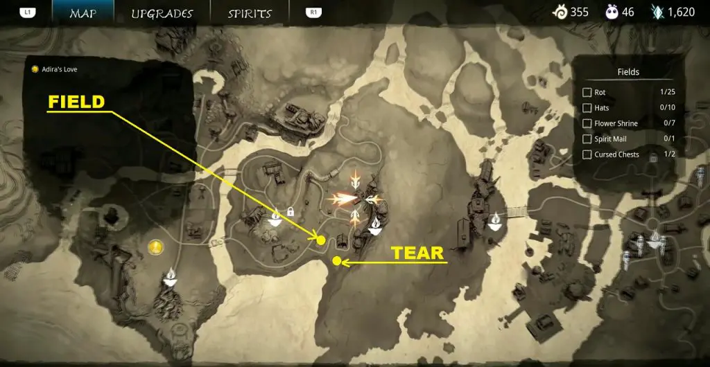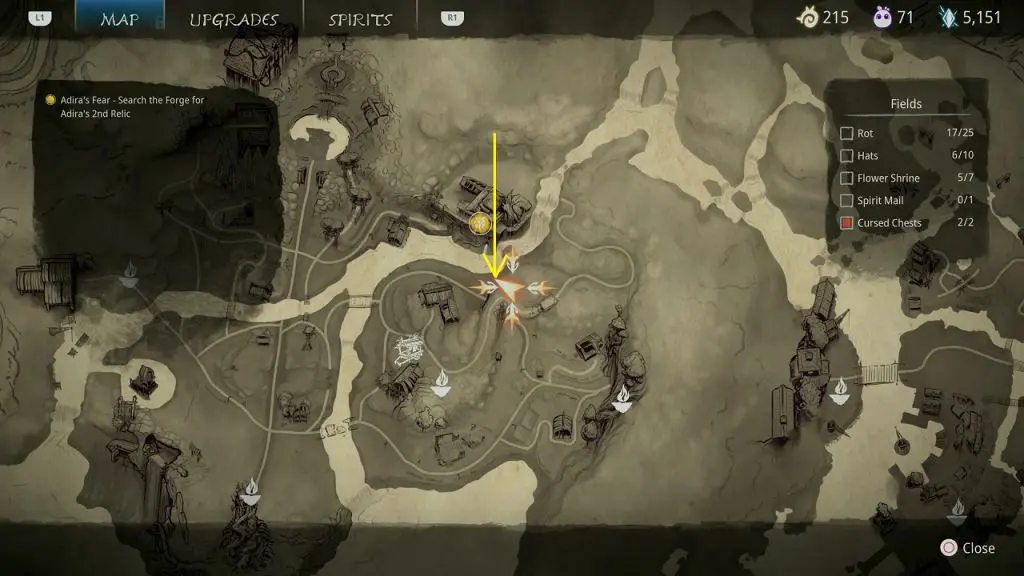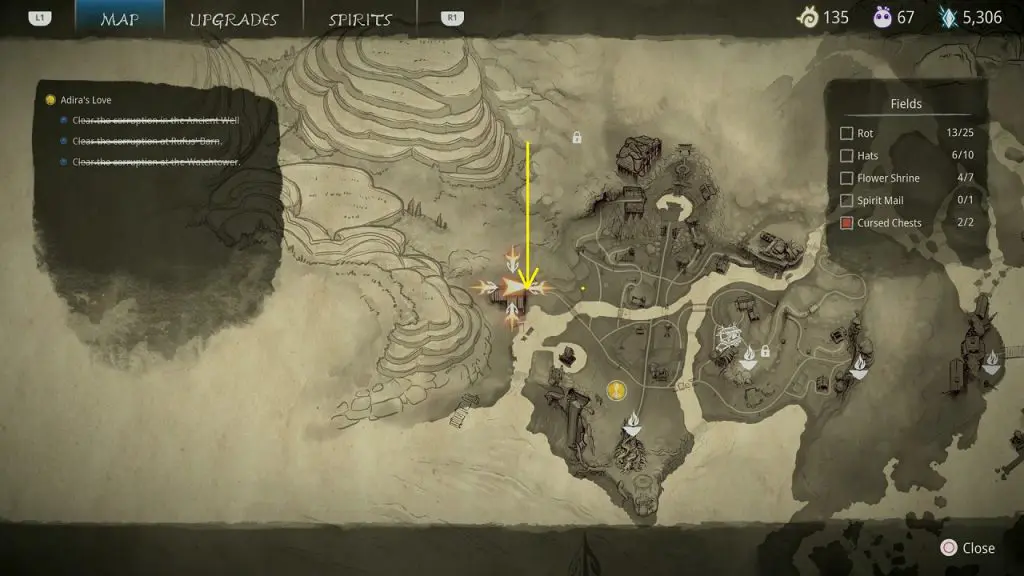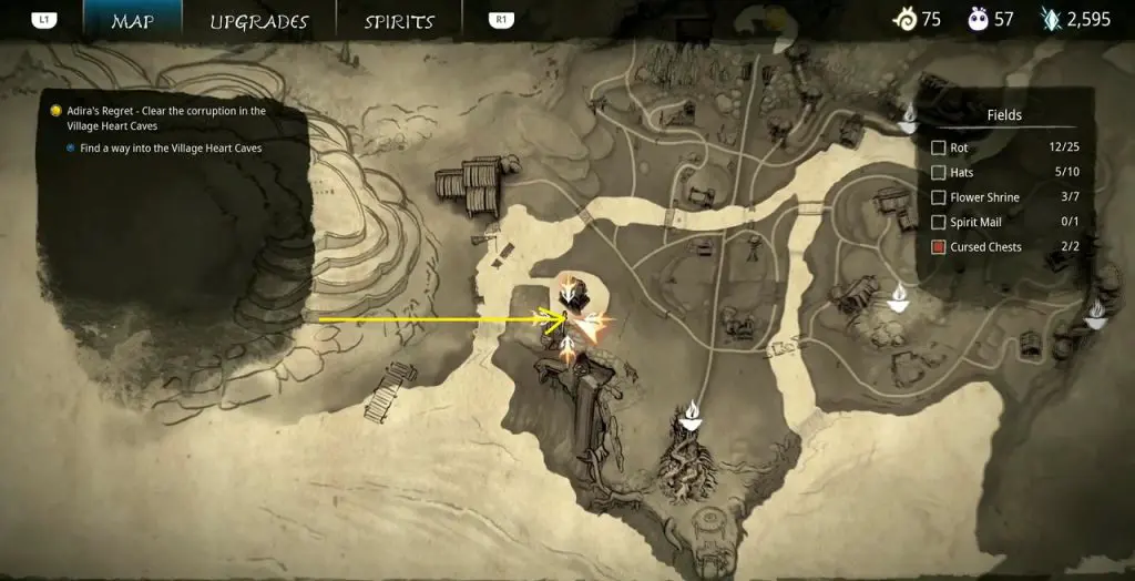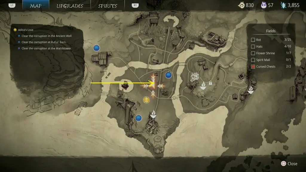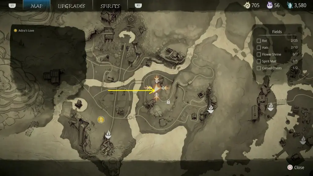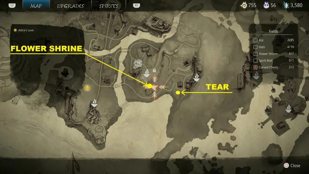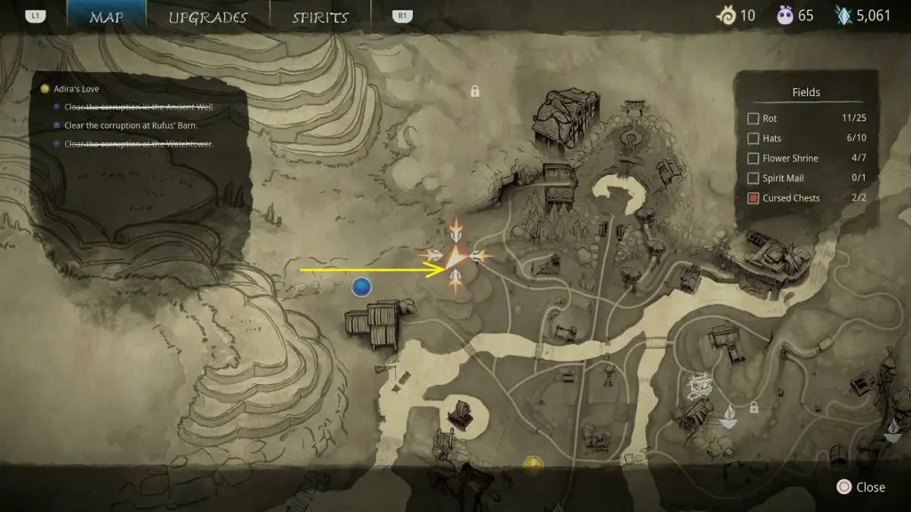 This guide shows how to get all the collectibles in the ‘Fields’ area in ‘Kena: Bridge of Spirits’. There are a total of 45 collectibles in the Village Heart (25 Rots, 10 Hats, 7 Flower Shrines, 1 Spirit Mail, 2 Cursed Chests).