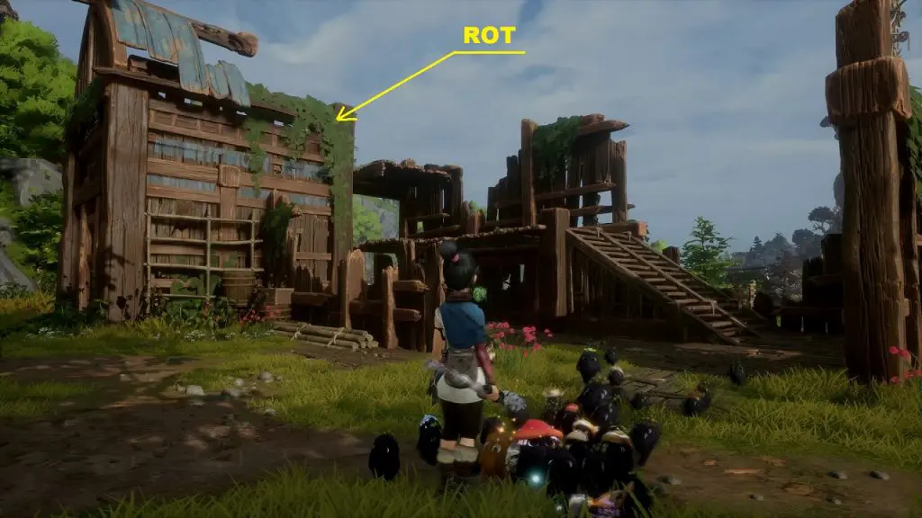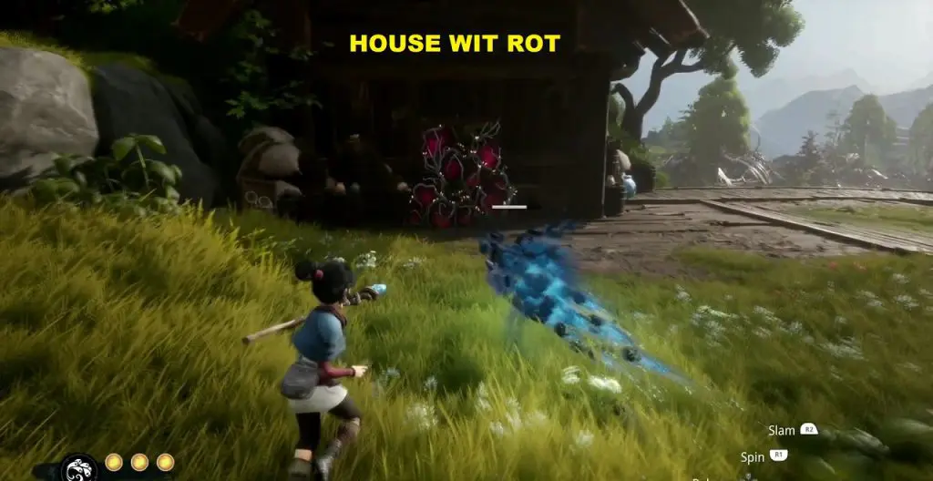 The rot is inside a house as shown in the picture below. But to get there, first, you need to go inside the house containing water as shown below. Enter the house containing the water by grappling to the blue flower (see the second picture below). Inside the house, you will find a bucket of water. Tilt the bucket to drop the water. Then open the door and guide the water drop outside.