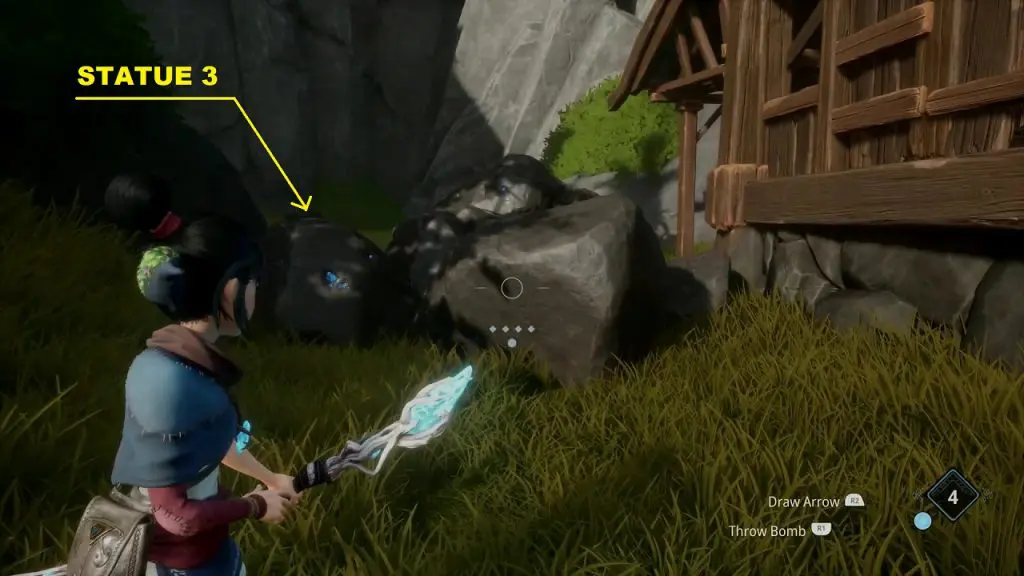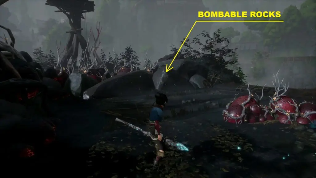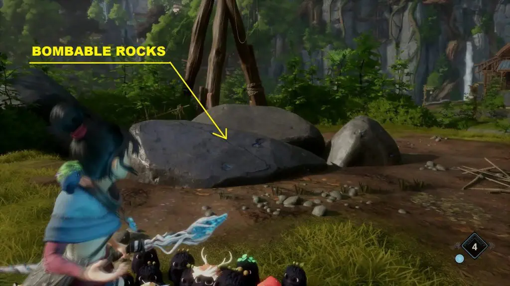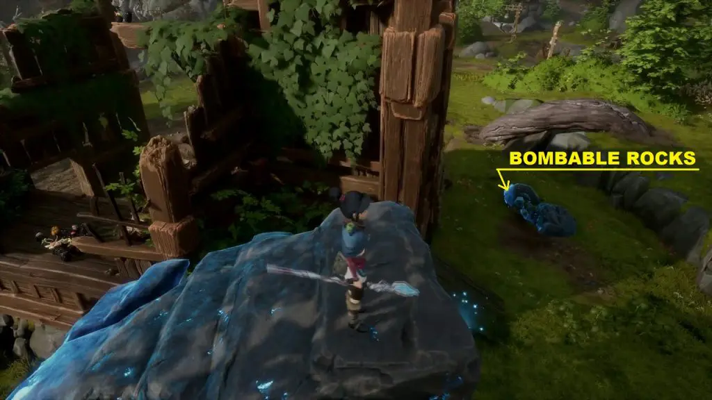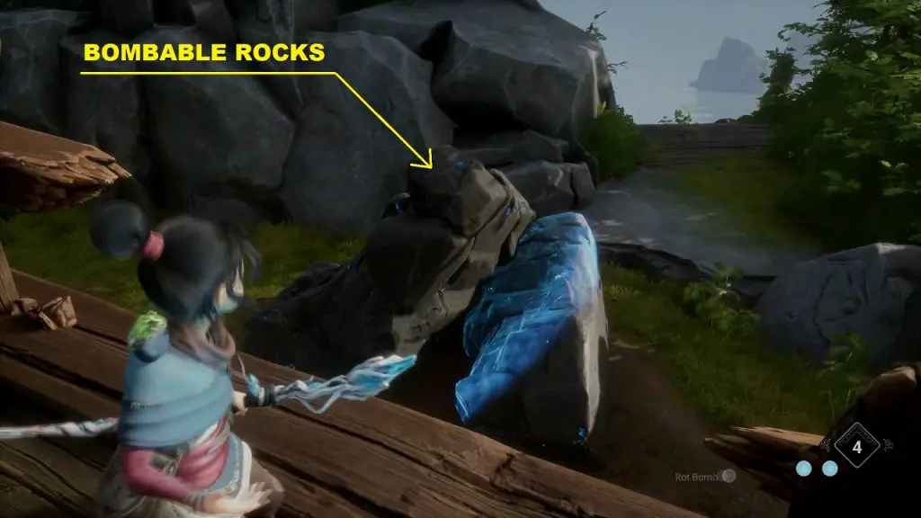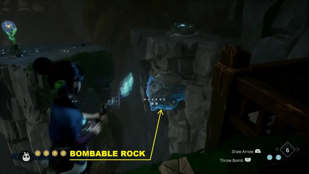 Now throw a bomb at the bombable rock on the right side as shown below. This will make the rock levitate and form a bridge across the two platforms.