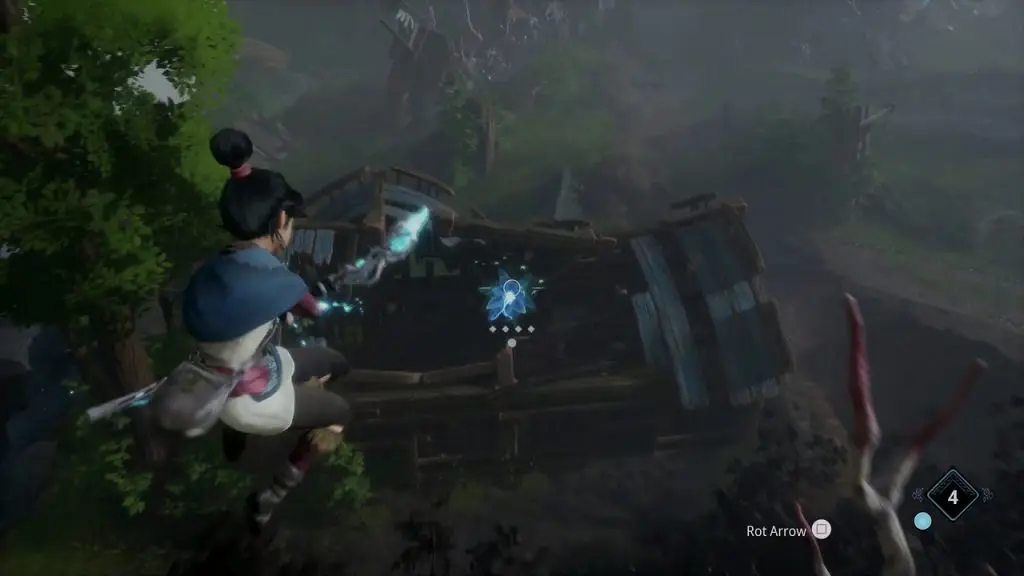 Cleanse the house entrance with the forest tear. Then go inside the house and grapple to the blue flower inside to reach the opposite end of the house. The rot is under a pot there.