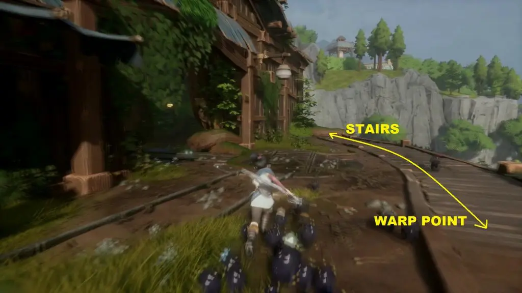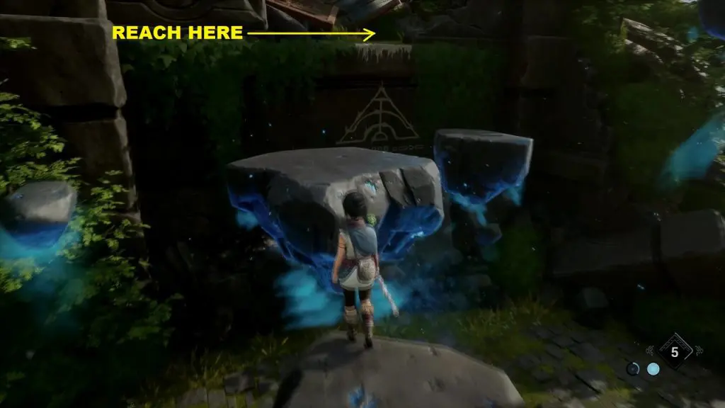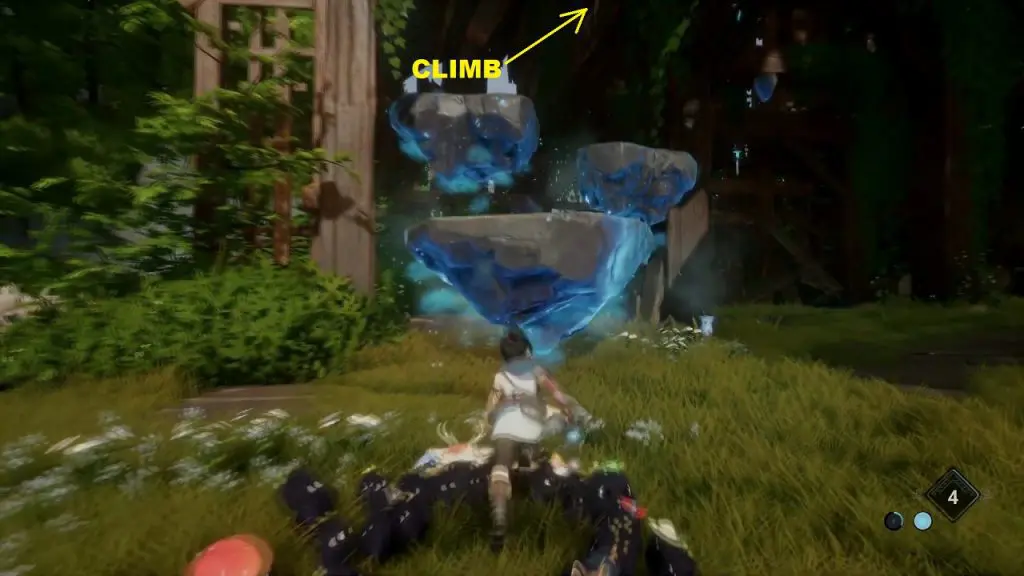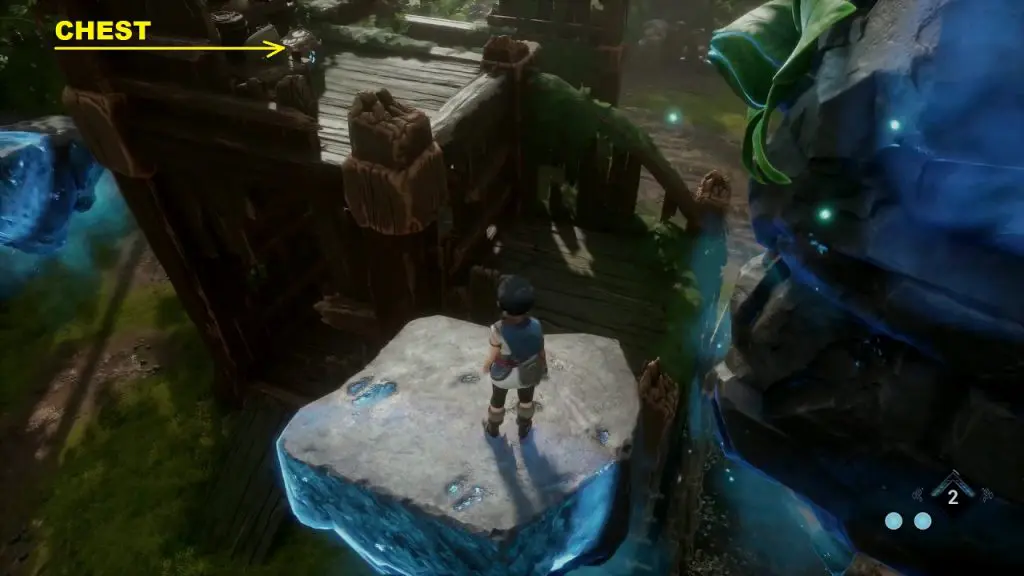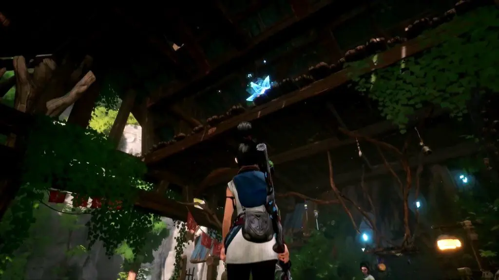 Then grapple onto the blue flower to reach the rock. From here jump to the top of the building and open the chest to get the rot as shown below.