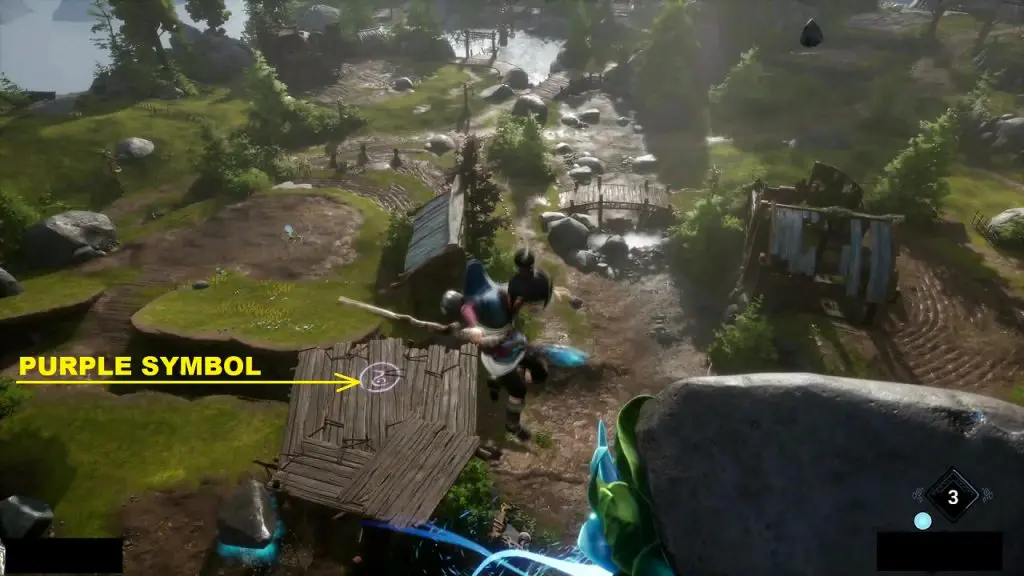 At the location shown below, you will find a few bombable rocks. Throw a bomb on them to make them levitate. Then use the blue flowers on the rocks to jump to the top of the platform with a purple symbol (see the third picture below). Stand on the purple symbol and use pulse. This will start a shooting minigame. Shoot 10 targets ad the rot will appear.