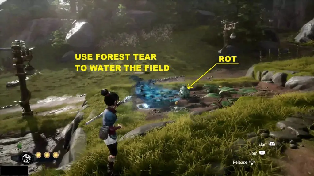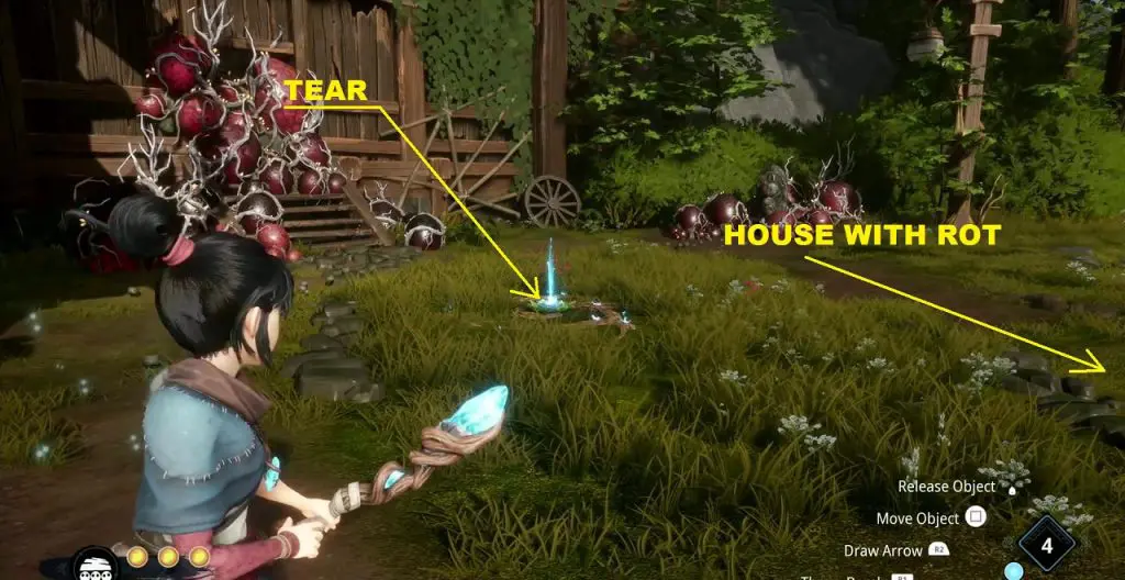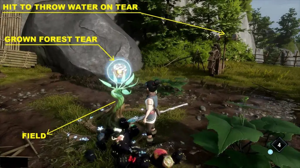 Guide the water droplet to the tear as shown in the picture below. This will make the tear plant grow. Summon forest tear from the plant and guide it to the house containing the rot as shown below.
