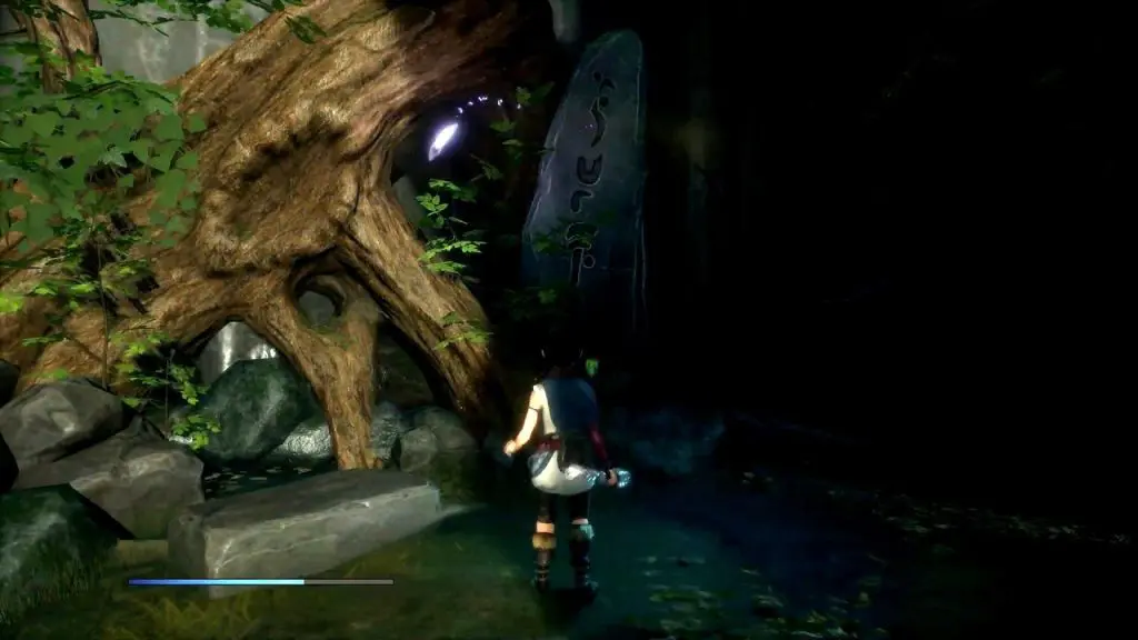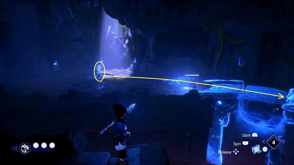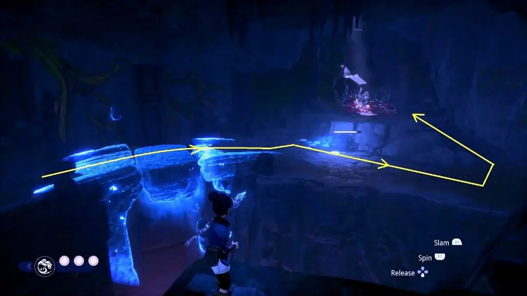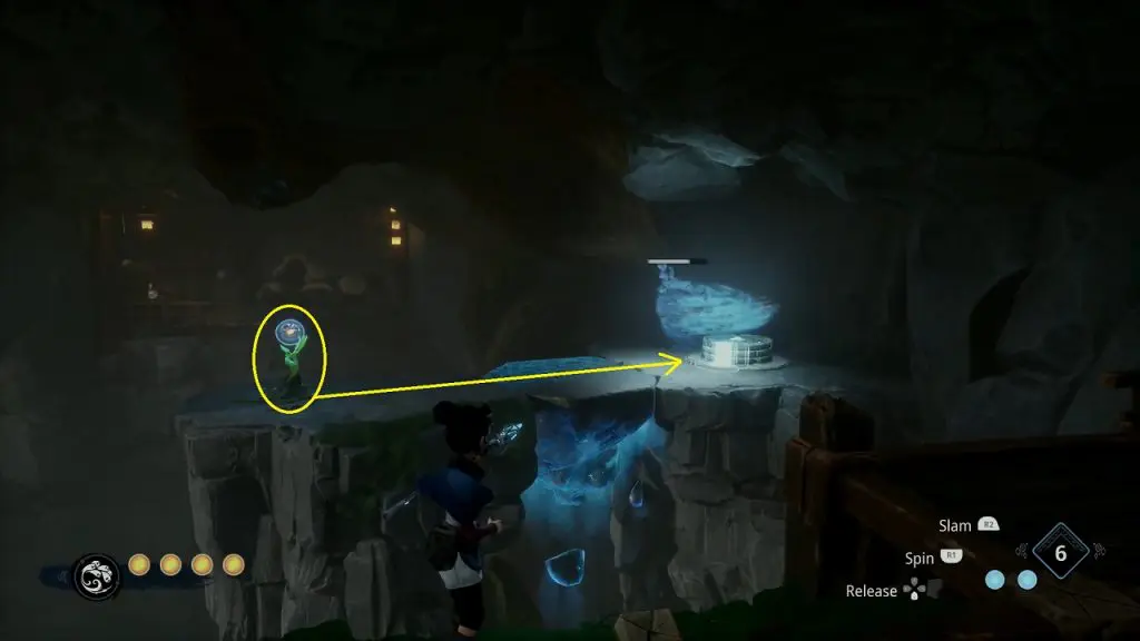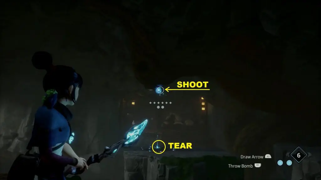 After reaching the cavern, you will see a tear on a platform in front of you. Shoot the crystal above the tear for water to fall on the tear. This will make the plant grow.