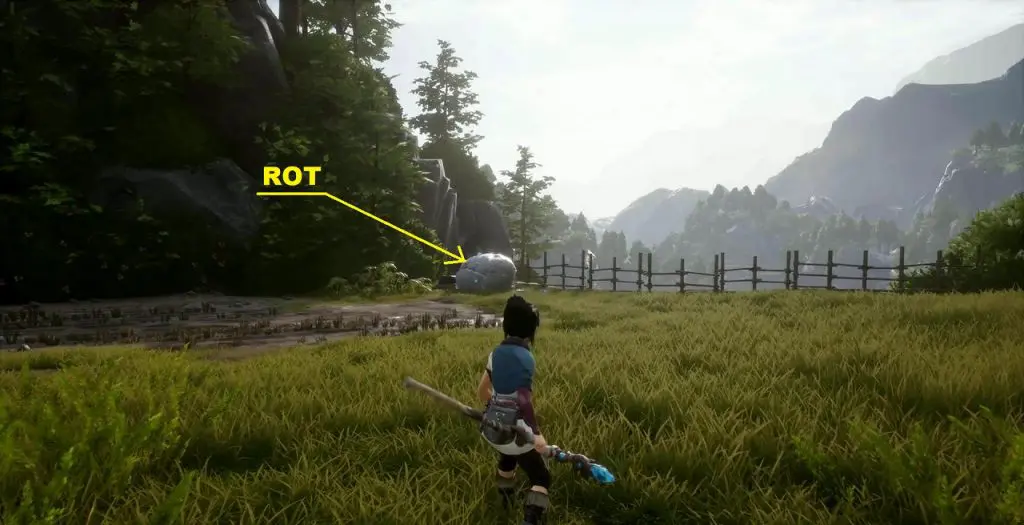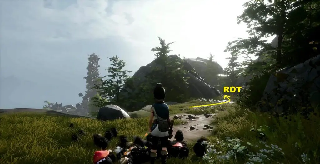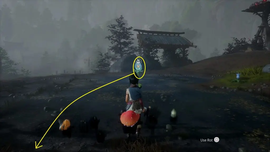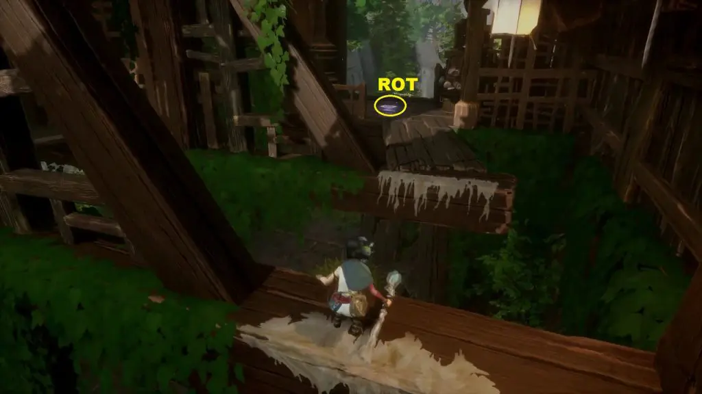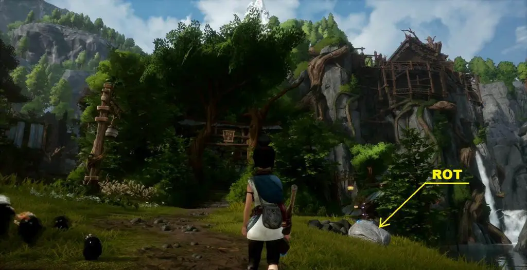 This rot is in a small field at the location as shown in the picture below. To get the rot first go to the location southeast of the field as shown below. At this location, you will find a tear. Shoot the mechanism south of the tear and it will throw water on the tear and make it grow into a plant (See the second picture below). Now summon forest tear from the plant and guide it to the small field. Water the field with the forest tear and some vegetables will grow. Rot in underneath one of the vegetables as shown in the third picture below.