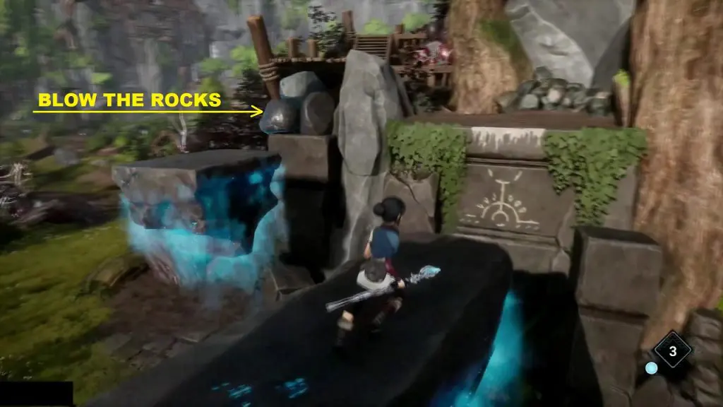 From here, bomb another set of rocks as shown in the picture below. This will make the rocks levitate in the air. Shoot the switches on the floating rocks to align them properly.