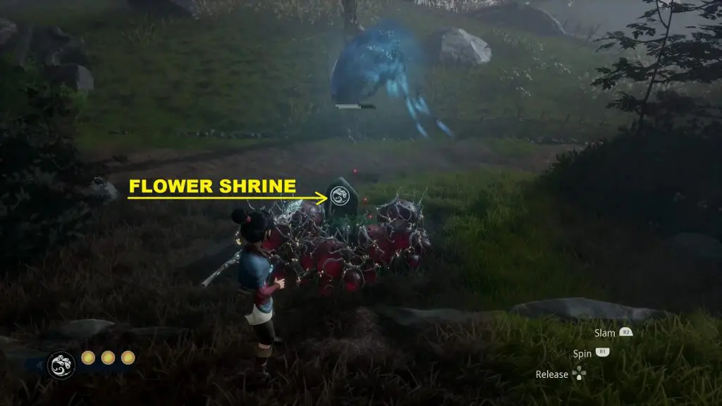 The flower shrine is near the wood bridge leading to Rufus Barn. Summon tear from the plant highlighted below then guide it through the wooden bridge to reach the shrine and cleanse it.