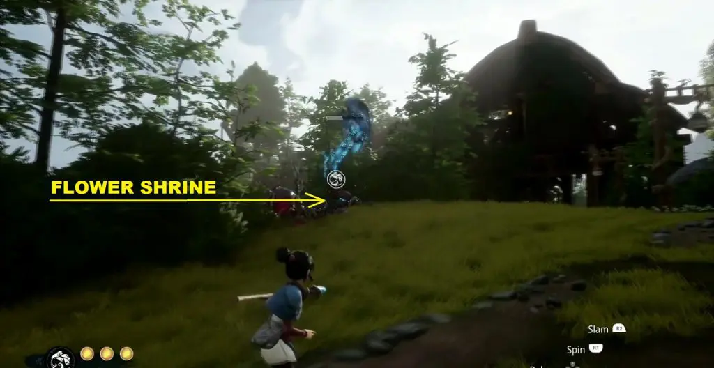 The Flower Shrine is at the location shown below. Next to the shrine is a tear. To grow the tear plant you will need water. Go inside the house containing water as shown below. Enter the house containing the water by grappling to the blue flower (see the second picture below). Inside the house, you will find a bucket of water. Tilt the bucket to drop the water. Then open the door and guide the water drop outside to the tear. This will make the plant grow. Summon forest tear from the plant and use it to cleanse the forest shrine as shown in the third picture below.