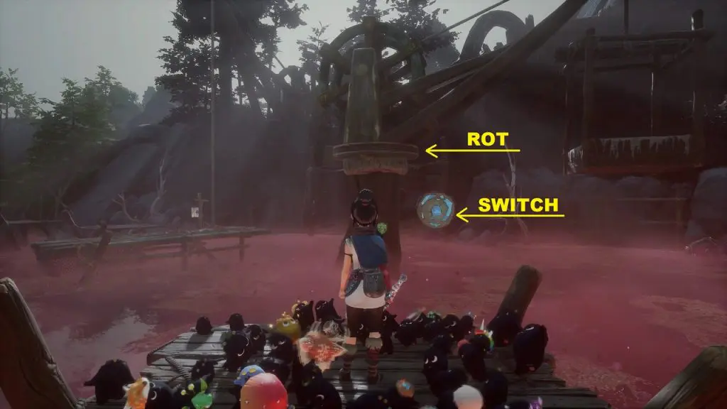 The rot is inside a chest near the poison swamp at the location shown below. Hit the switch as shown in the second picture below. This will make the platform start moving. When the platform comes in front of you, jump on it. When the platform reaches the backside, jump out to it to reach the platform containing the chest (see the second picture below). Open the chest to get the rot.