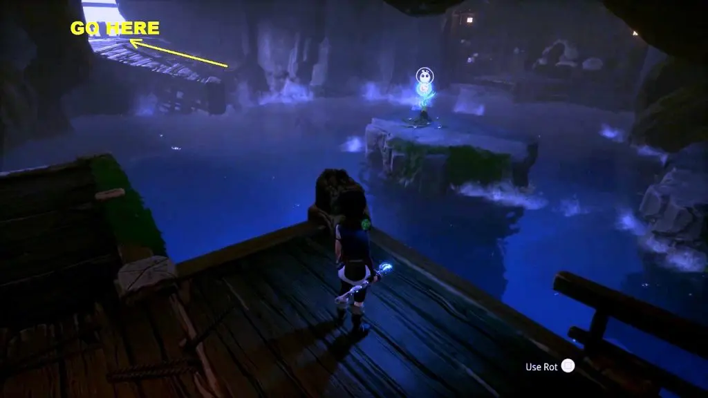 At the location shown below, you will find bombable rocks. Throw the bomb and this will make the rocks float. Use the floating rocks to jump on the upper platform. Then carefully walk on the beams to reach the rot as shown below.