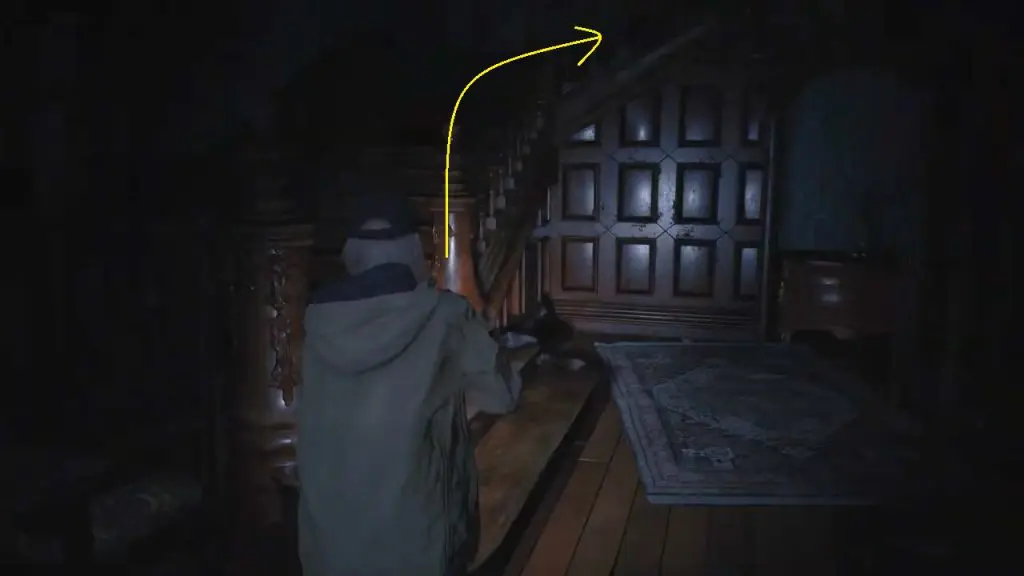 Enter the hall through the door shown in the cutscene. Go upstairs after collecting the gunpowder on the table. Grab some chem fluid and a note describing how to make both ammo and first aid meds.
