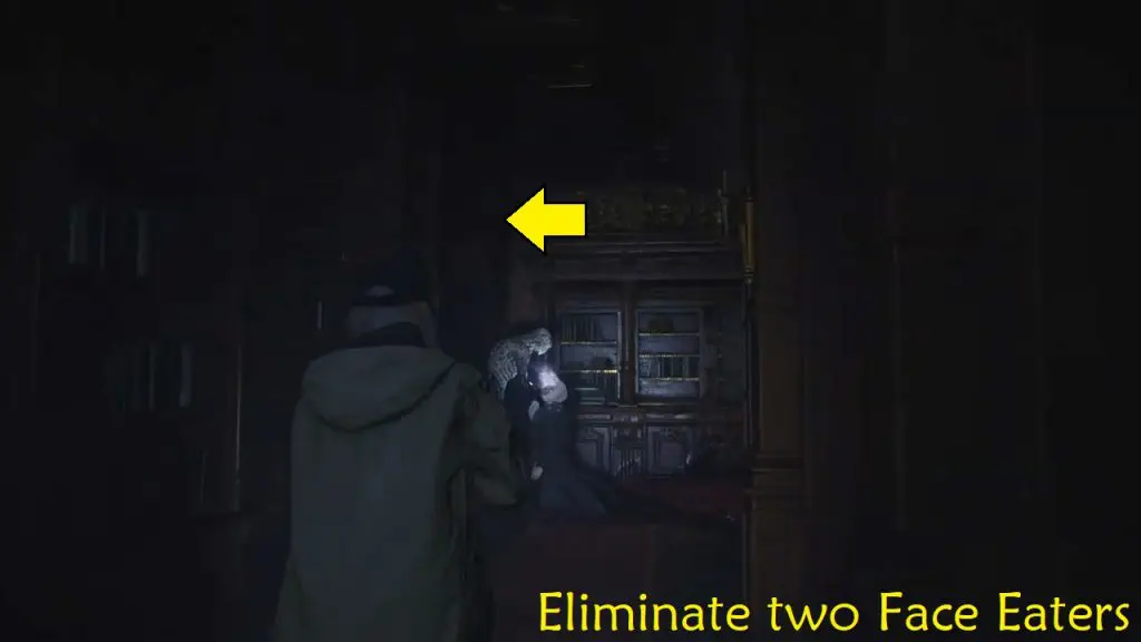 Go to the library ( via only the unlocked door upstairs).  Eliminate two Face Eaters and exit the library from the other door. Continue on until you get to the studio.