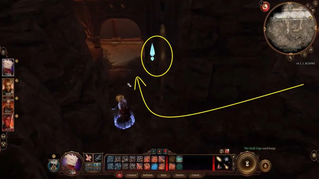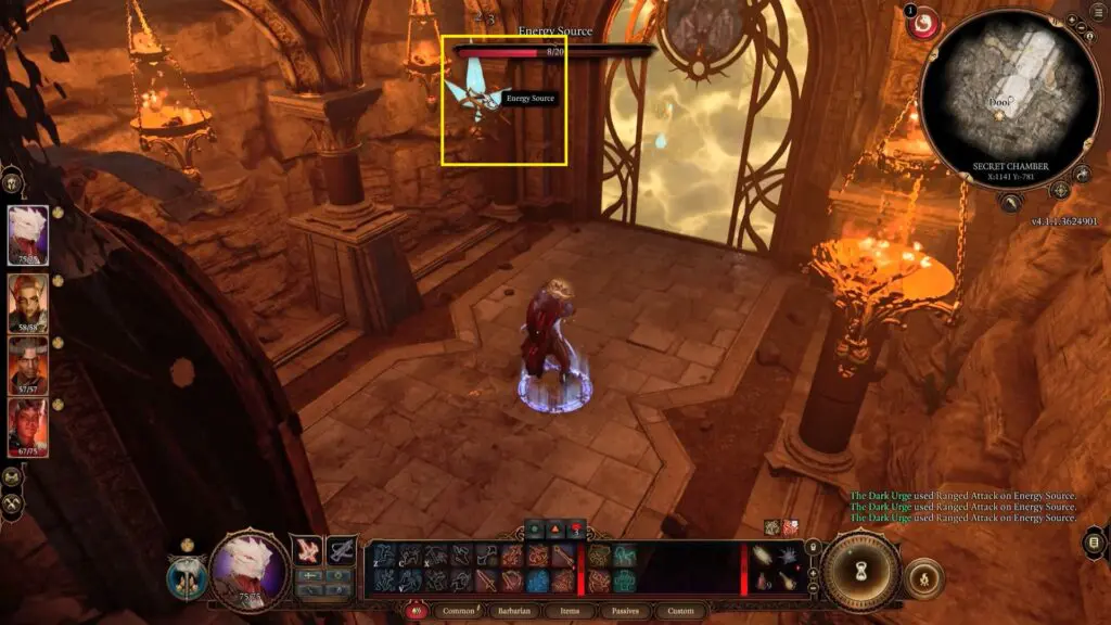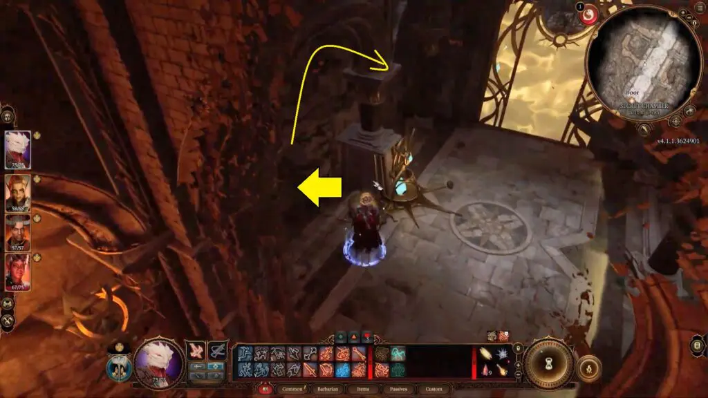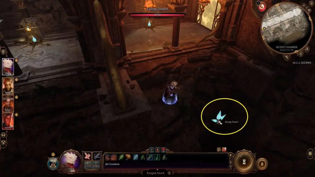 This will open a secret path. Enter inside and descend the staircase. You’ll enter a Secret Chamber at the bottom. To continue your journey ahead, you’ll need to destroy the energy sources to remove the barriers.