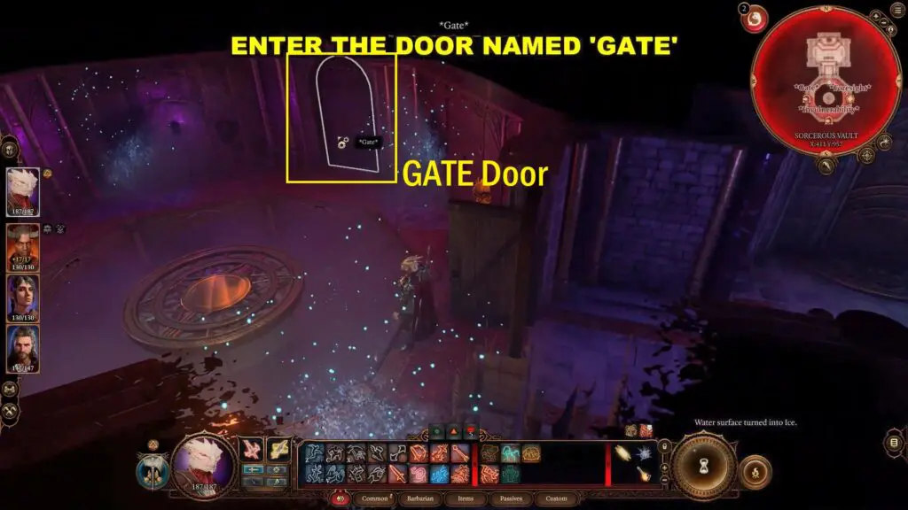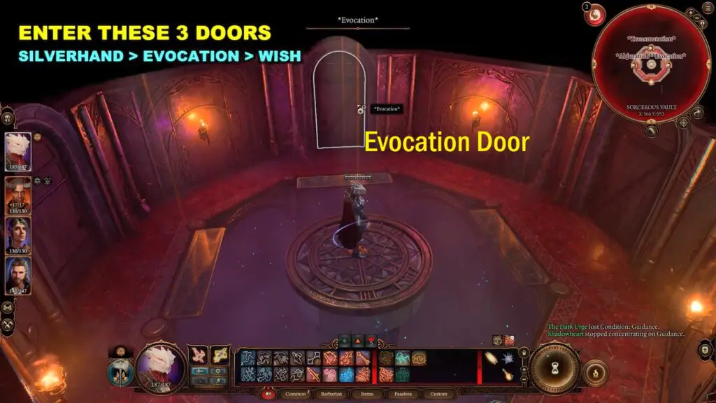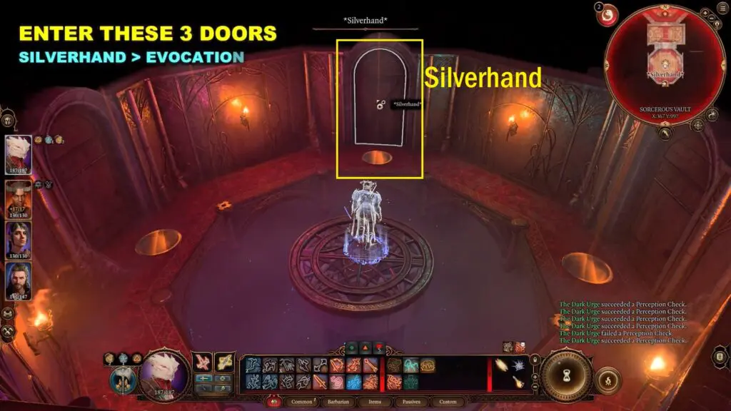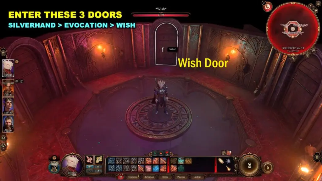 In the minimap you can see the name of the room is Silverhand. Pass the “Sleight of Hand” check and enter the door with the name Silverhand Door. Simillary pass through the Evocation Door and Wish Door.