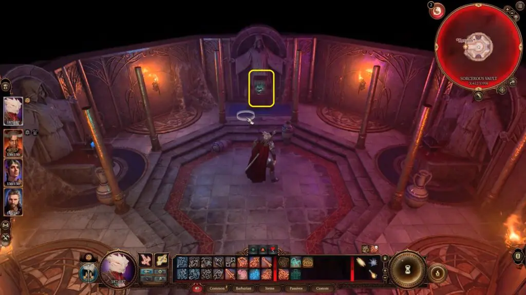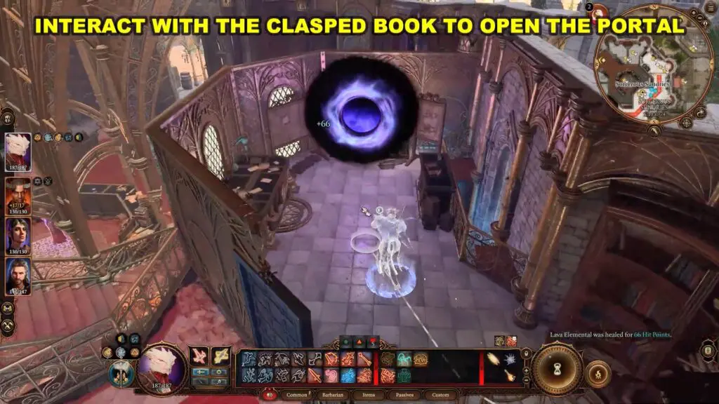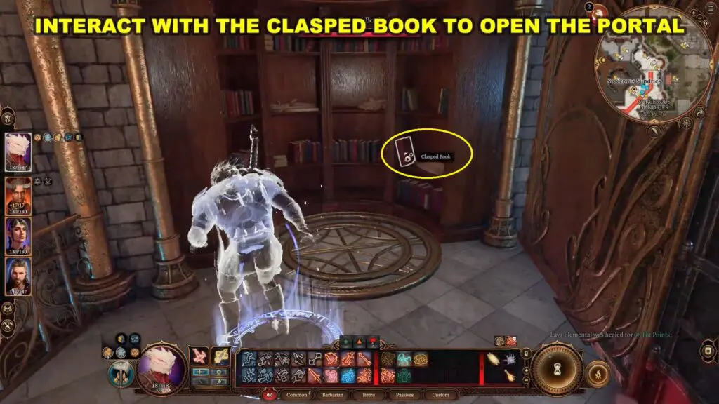 Interact with the “Clasped Book” book to open a portal. Enter the portal and this will transport you to the Sorcerous Vault.
