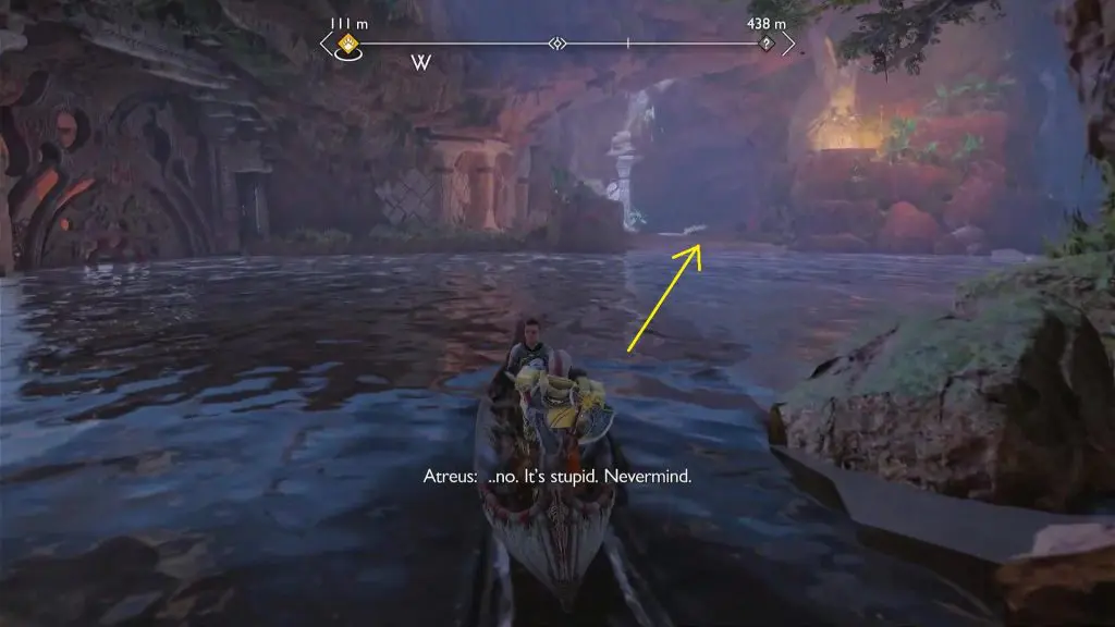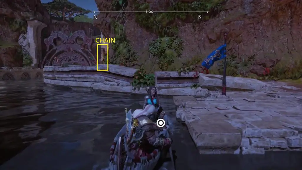 Go to the dock near the mystic gateway as shown in the picture below and hop on the boat. Row the boat back to the area where you destroyed the pillars to start the quest. Open the gate on the north side of the area by pulling the chain near it as shown in the second picture below. Then continue ahead and dock the boat on the beach as shown in the third picture below.