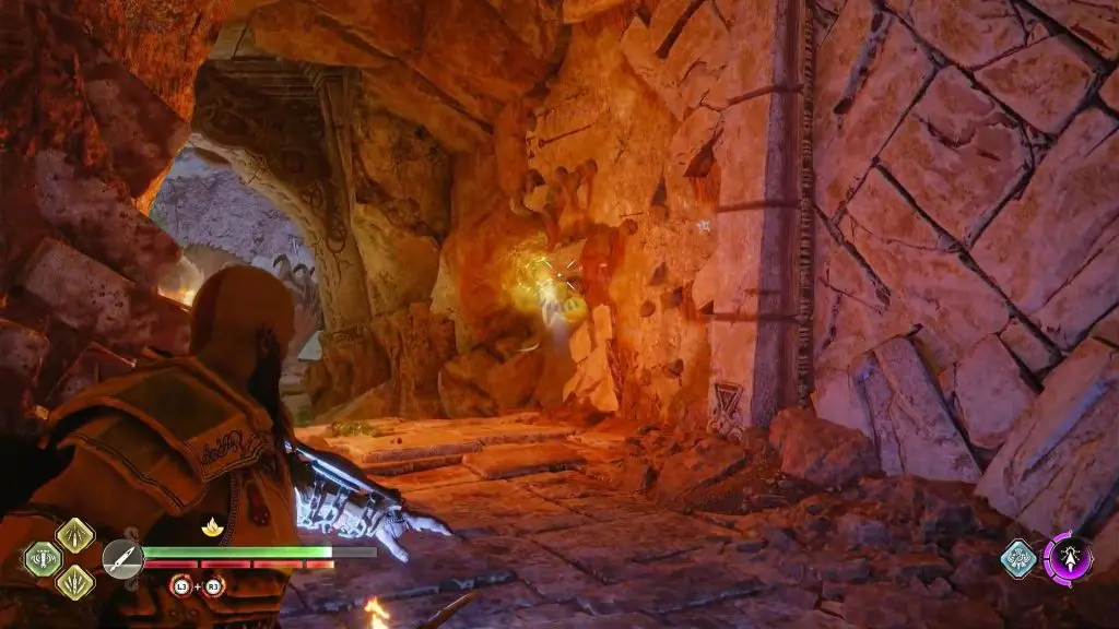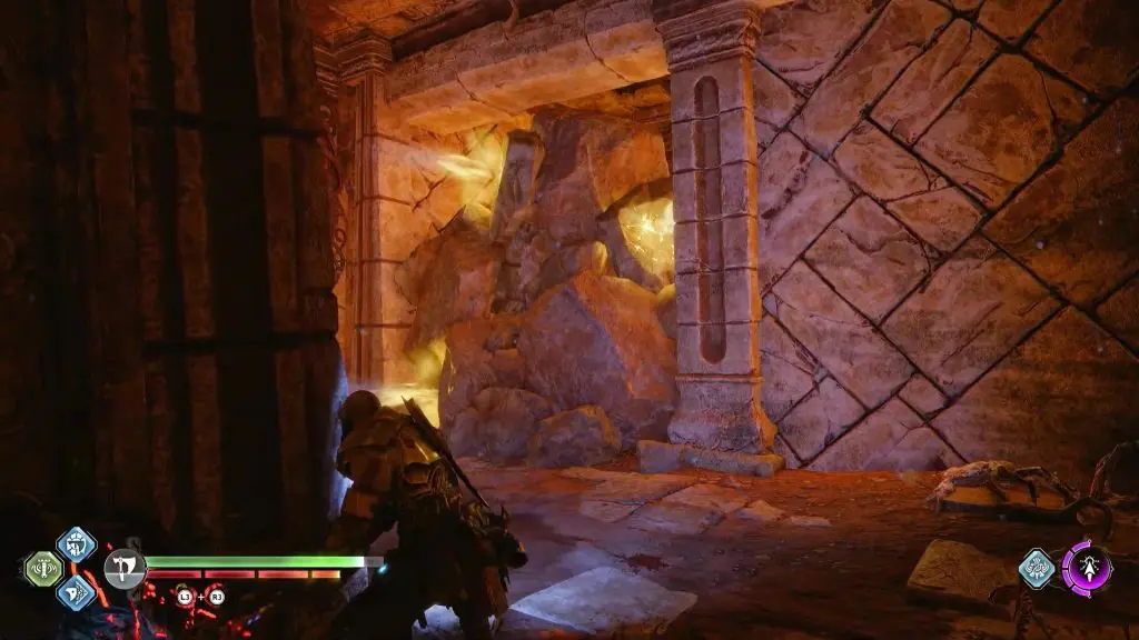 Open the gate straight ahead and open the gate. Use your spear to destroy the rocks on the right side of the hallway as shown in the picture below.