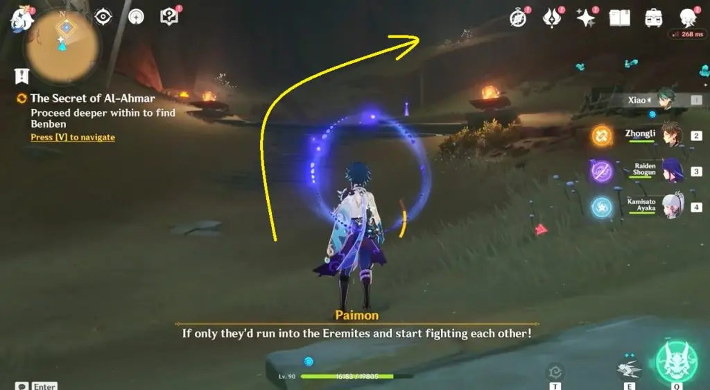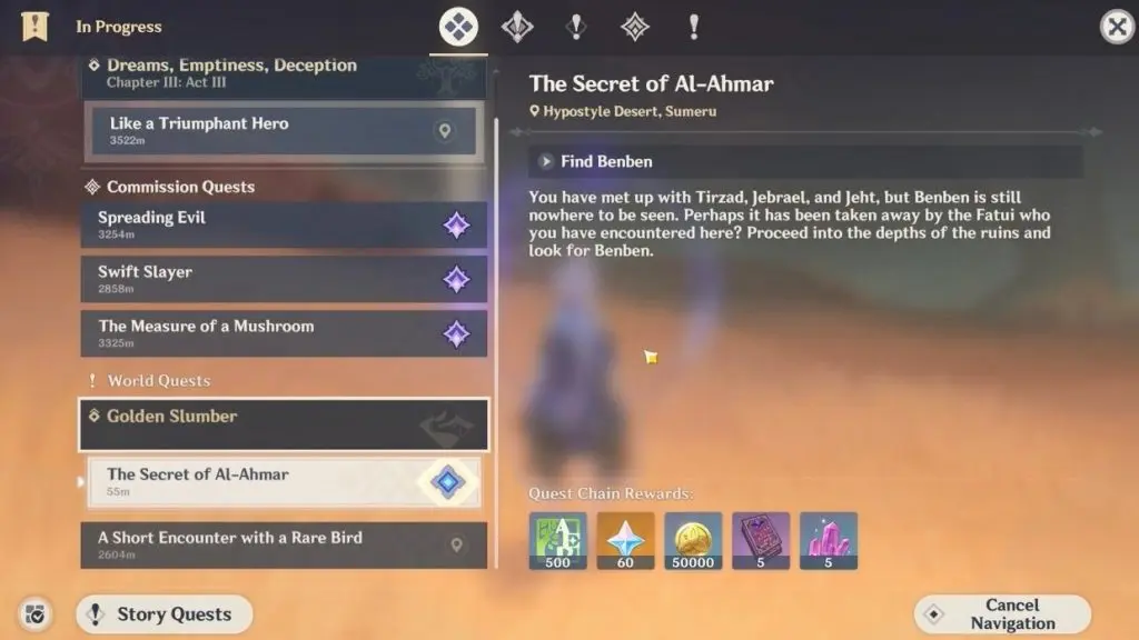This guide shows how to complete the objective “Find Benben” in the world quest “The Secret of Al-Ahmar” in the game of Genshin Impact 3.1 update, which was released on 28th September 2022. This is the 3rd quest of the “Golden Slumber” questline.