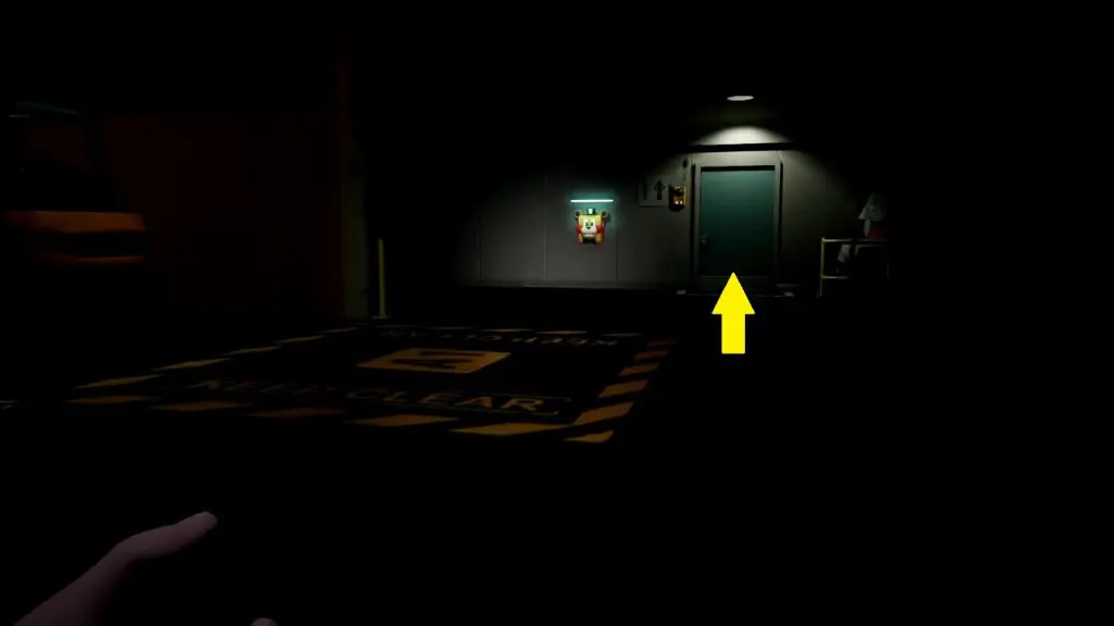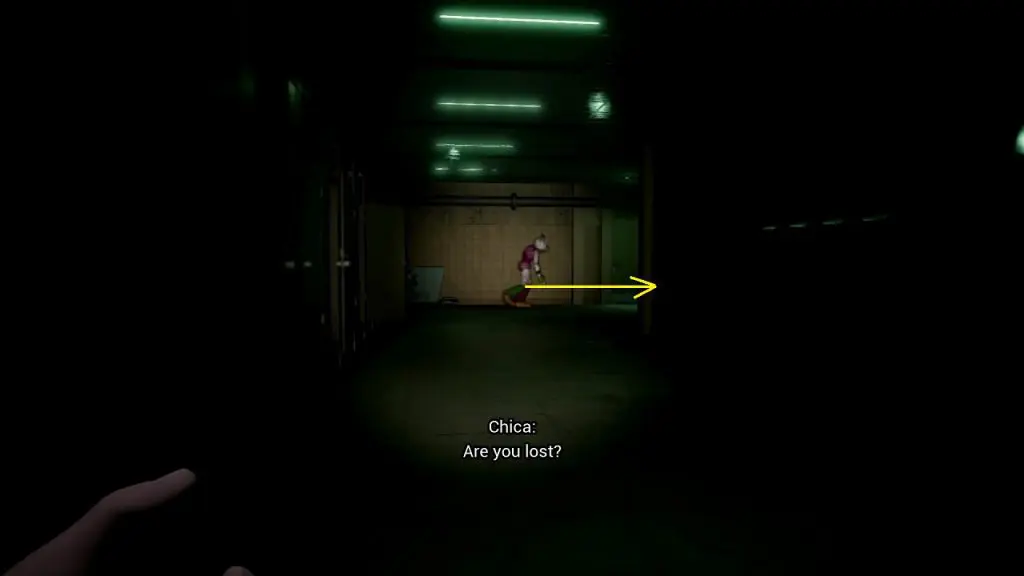 As you enter the room, you will see Chica in front of you as shown below. There are two doors in this room. Chica will go through the door right in the front. Don’t go through this door, but take the door on the right side instead as marked by an arrow below.
