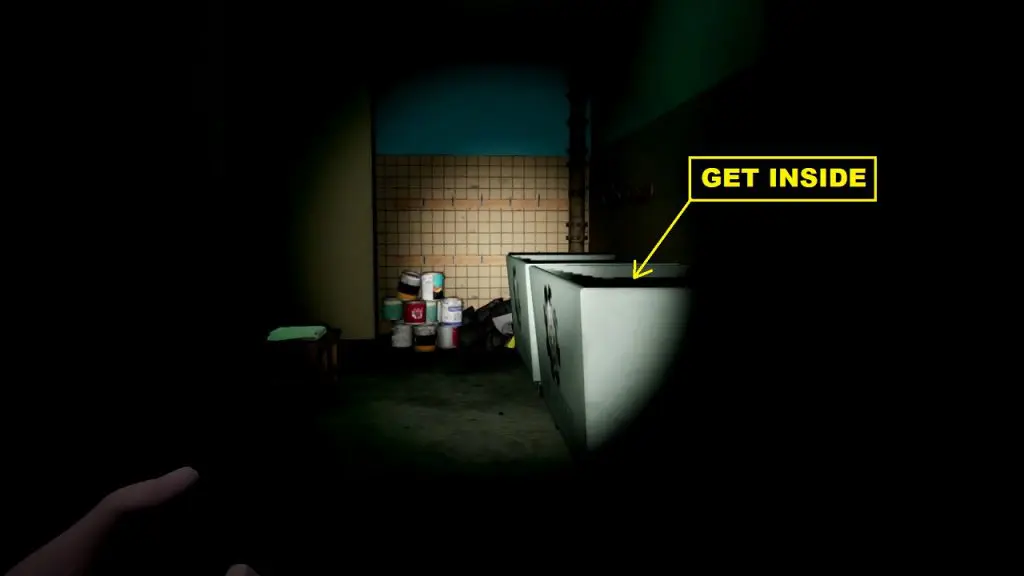 In the next room, take the door on the left side to reach the Locker Room. After passing through the door, you will see two trash cans in front of the entrance of the locker room as shown below. Hide inside this trash can.