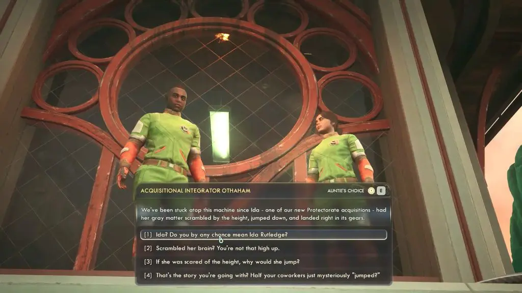 After the cutscene, speak to the two Auntie’s Choice workers stuck on the top of the tower. Ask them about Ida Rutledge, and they’ll confirm that she has died.