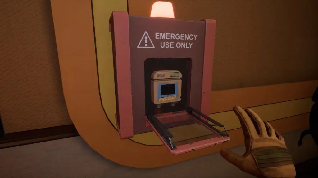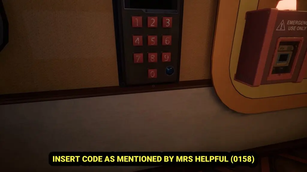 Insert the data drive into the machine and press the big red button to activate it. The machine will inform you that instructions are needed and direct you to retrieve the “Repair Cassette.” The Repair Cassette is located on the second-floor balcony of the new showroom. To access it, you’ll need to use a keypad on the wall. The code to unlock the cassette is 0158.