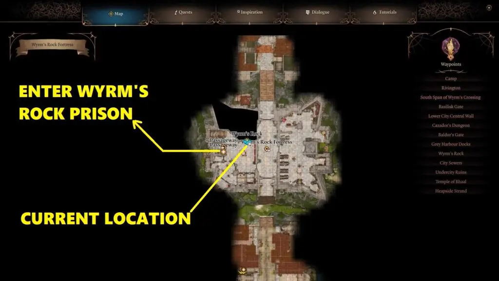 The best way to track down the entrance to Wyrmway is by making your way to the prison underneath the Fortress. First, make your way to the Wyrm’s Rock Fortress waypoint.