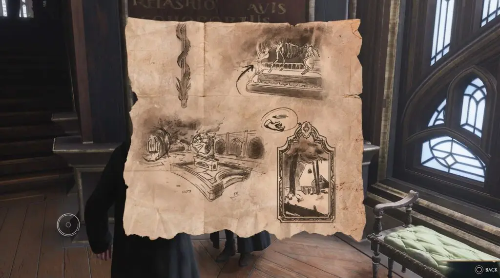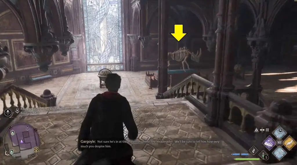 The first landmark given in Arthur’s treasure map is a rhinoceros skeleton. It is located on the lower floor of the Defence Against the Dark Arts area in The Astronomy Wing. You just need to go down the stairs in front of Arthur.