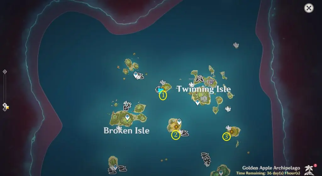 The location of the three Crystalline Cores Puzzles is marked as ‘1’, ‘2’, and ‘3’ in the picture below.