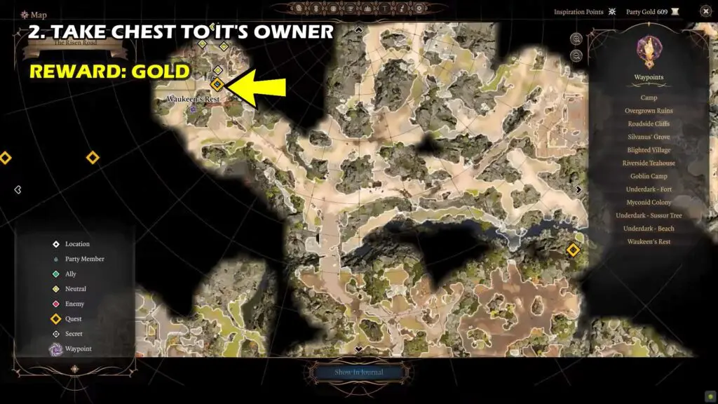 If you choose to take the chest to its Owner, then first you need to head to Waukeen’s Rest. Head to the building at the rear of the complex with the door lined with crates.