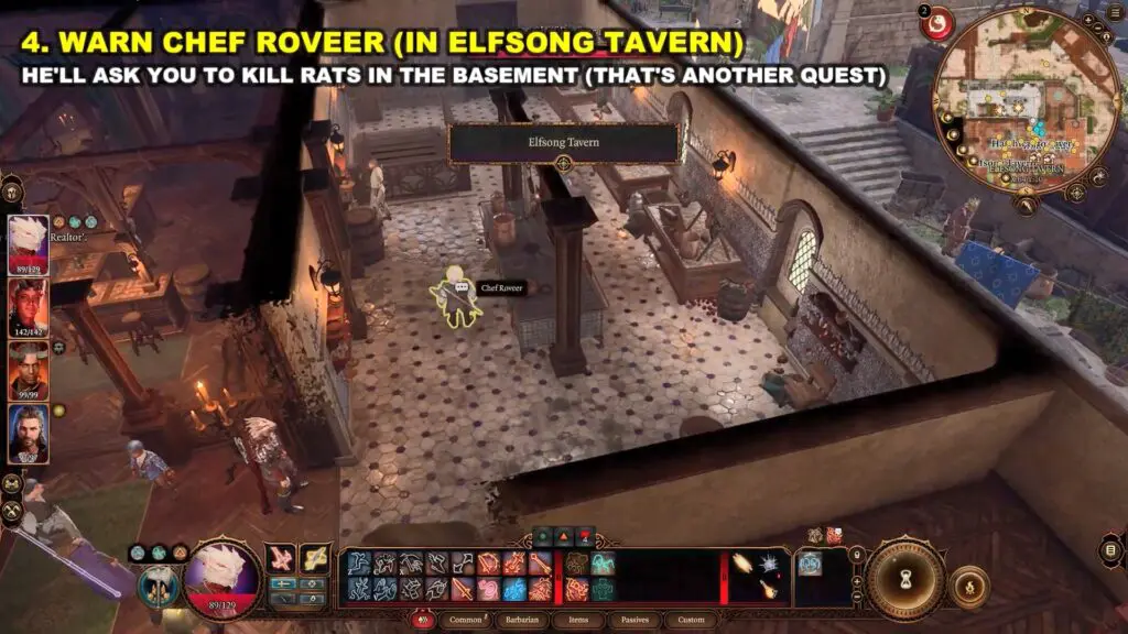 He is in the kitchen of the Elfsong Tavern. Go downstairs and into the kitchen. Talk to him and choose just the following dialogue choice before leaving to save the next victim.