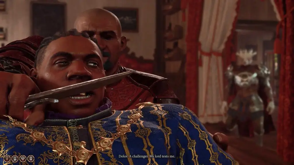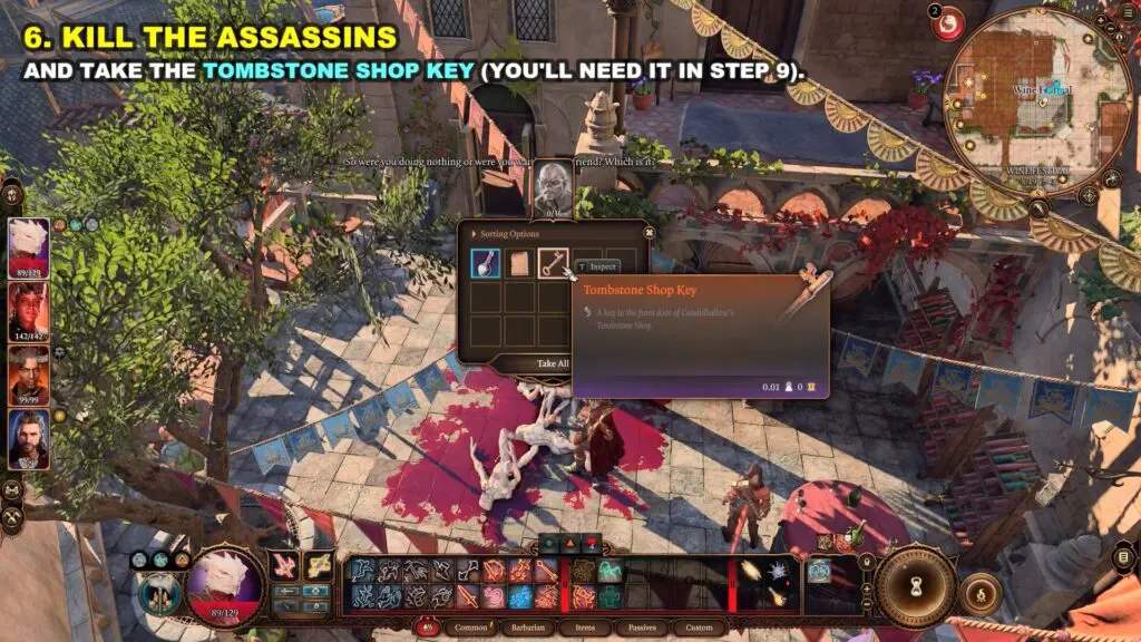 At this time Dolor will come and will threaten to murder you and your party for spoiling his fun. Kill all the assassins at the wine festival and loot their bodies to gain the Tombstone Shop Key.