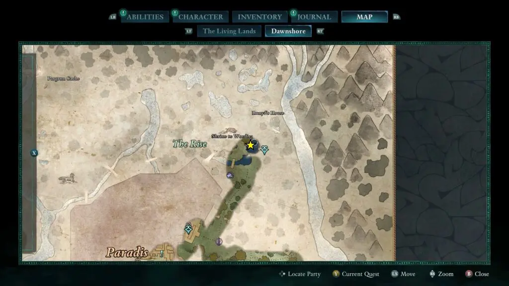 Instead, look for some ledges to the left of the second stone bridge. Climb up and head left. Cross the wooden bridge on the right to reach a broken bridge above the waterfall. This place is called the Shrine to Woedica.