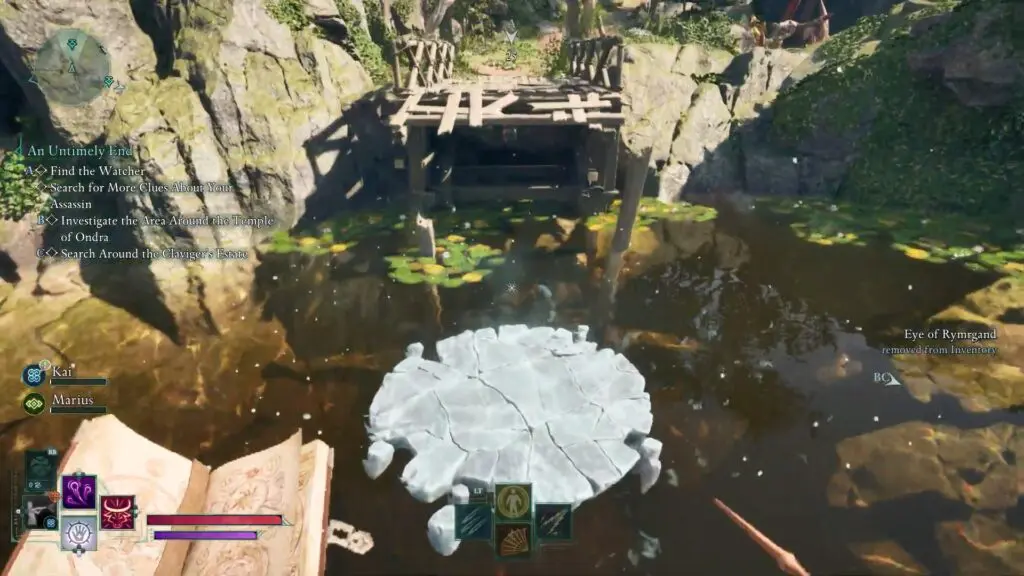 At the start of the wooden bridge, collect the Eye of Rymrgrand from the rocks. Open your skill menu and equip it. Throw the Eye into the water to freeze it, creating a path across the broken bridge.