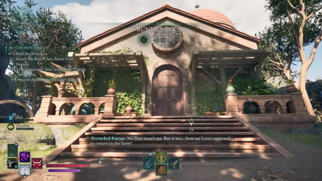 Keep moving forward and follow the path up until you find Runyd’s House. Enter and talk to Runyd, the Watcher.