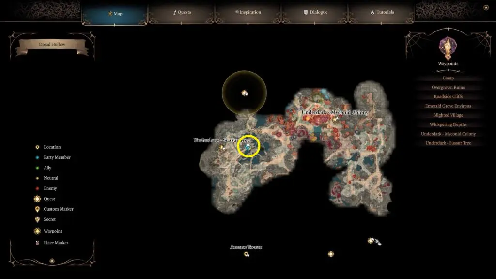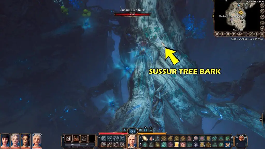 In the Underdark, you will end up near the Myconid Colony Teleport waypoint. The Sussur Tree can be found northwest of Underdark Beach. From here go west to locate the Sussur Tree’s fast travel point and make your way up to the branches of the tree. On one of the branches, you’ll find the tiny piece of wood known as the Sussur Bark. Pick it up and return to the Blighted Village.