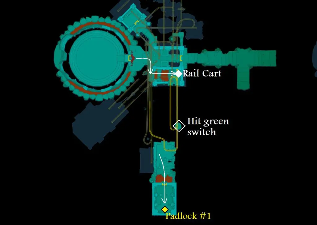 From the third Padlock location, drop back down to where the carts are. Hit the switch to lower the right tracks and then ride a cart to reach L3vel F3