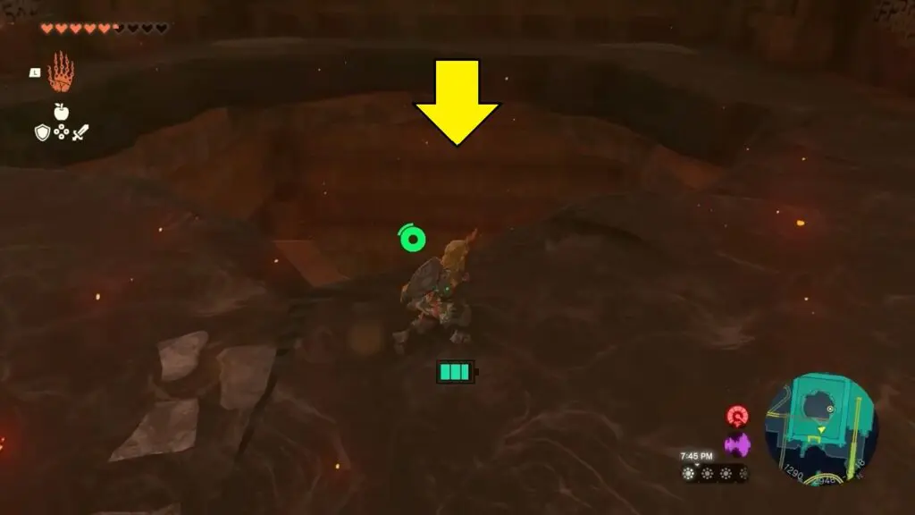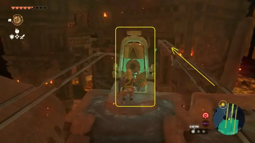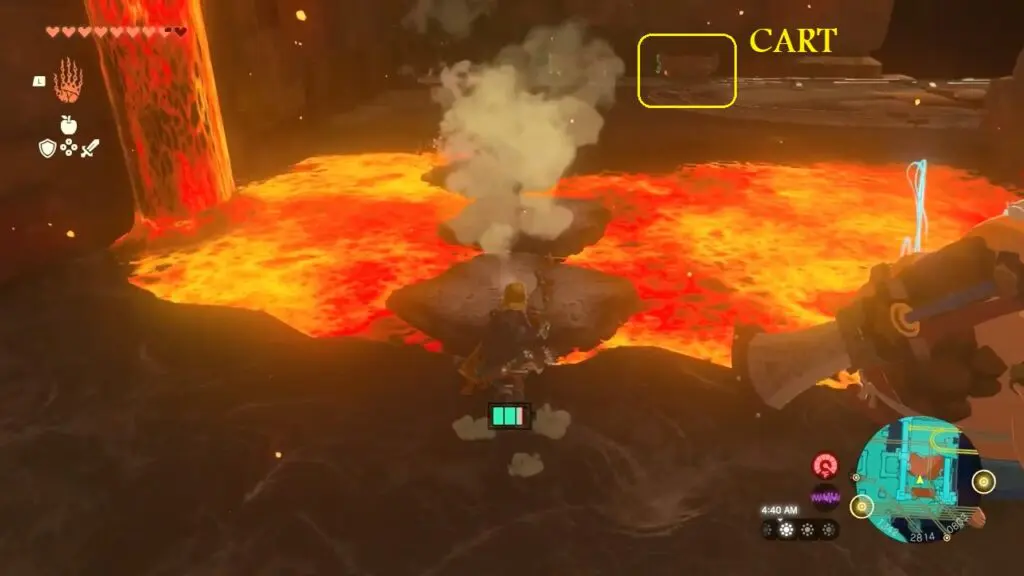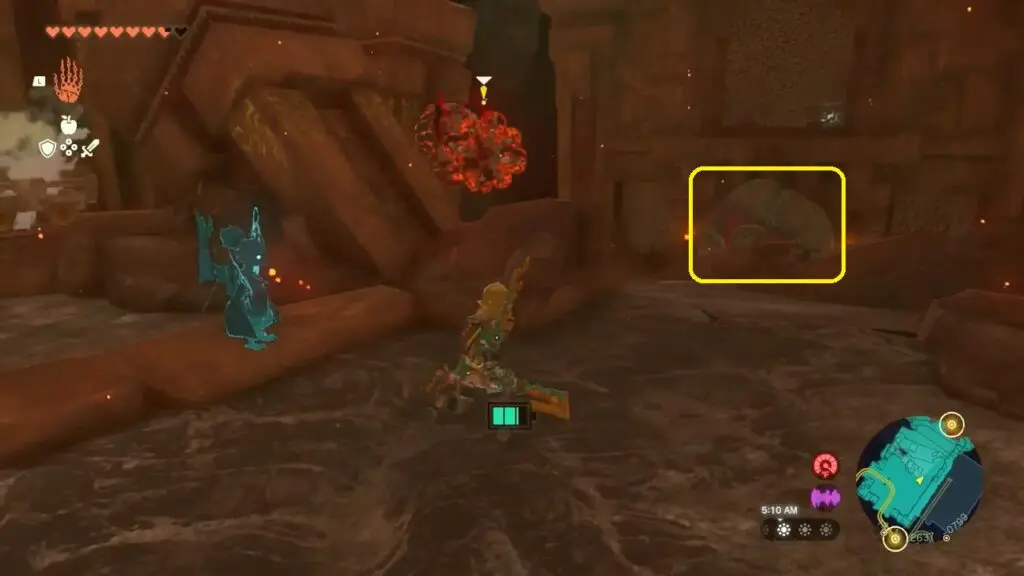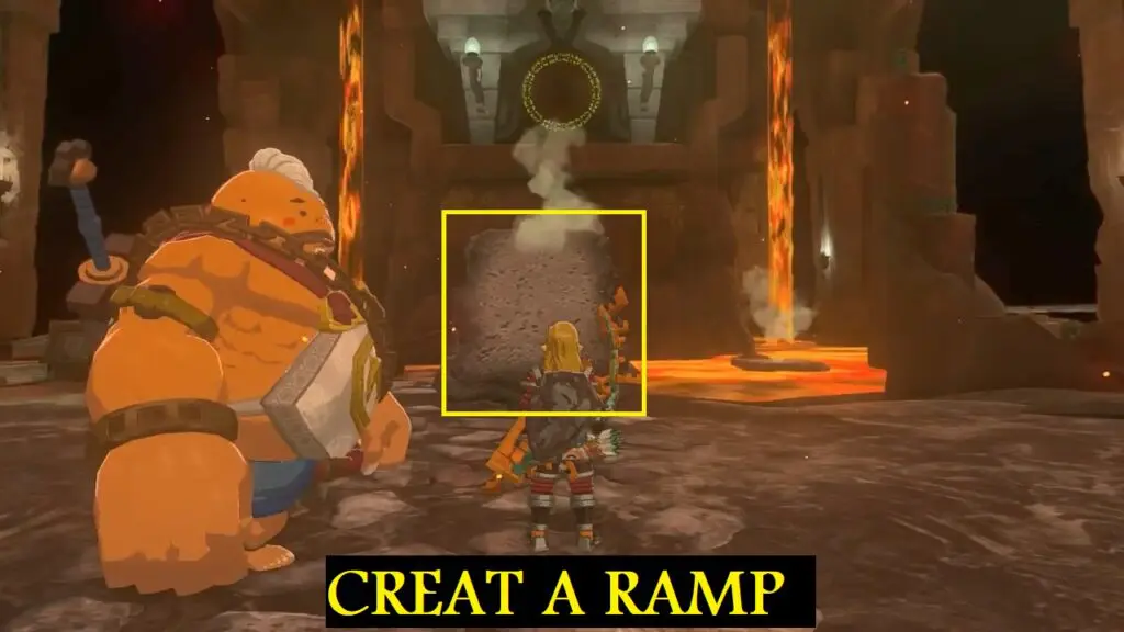 The lock is on a rock behind lava. Create a ramp as shown in the image and then Utilize Yunobo’s Charge attack to hit the padlock.