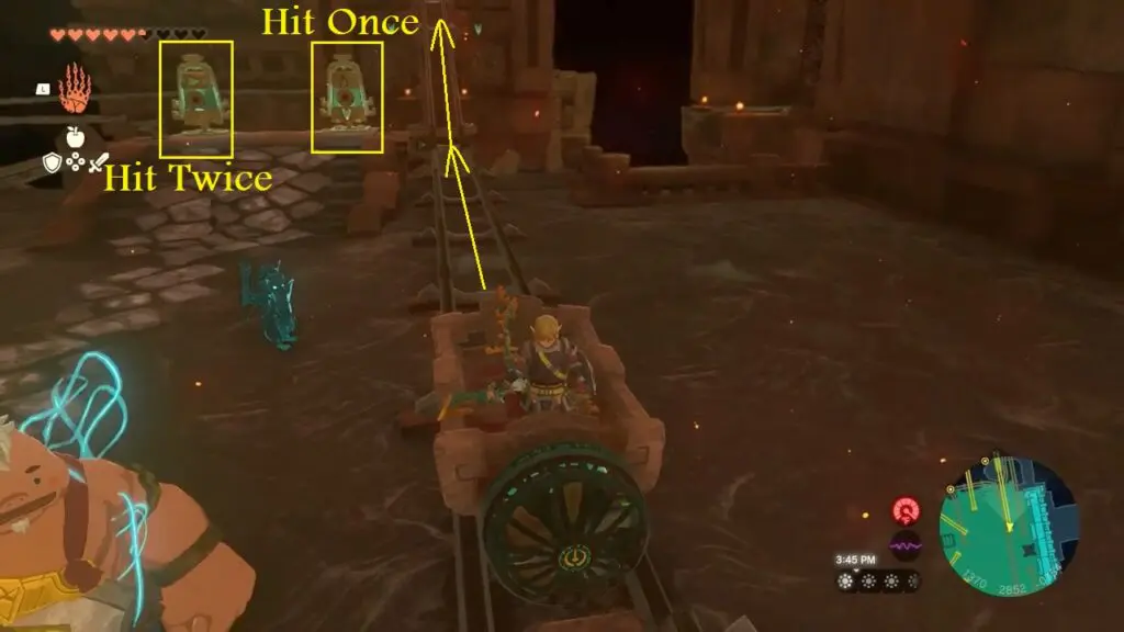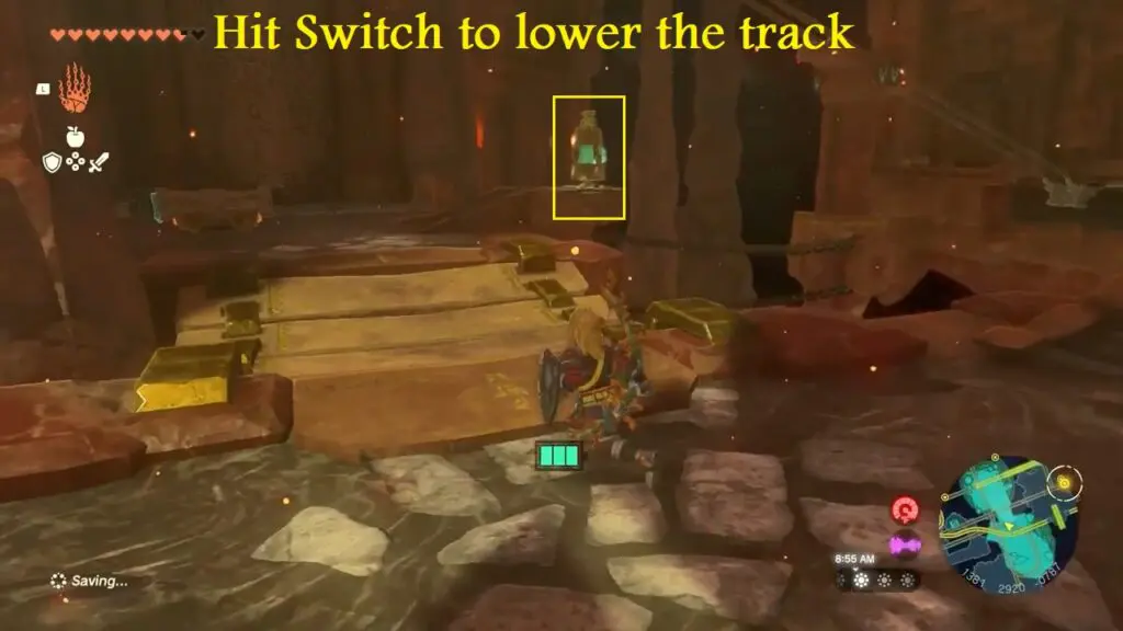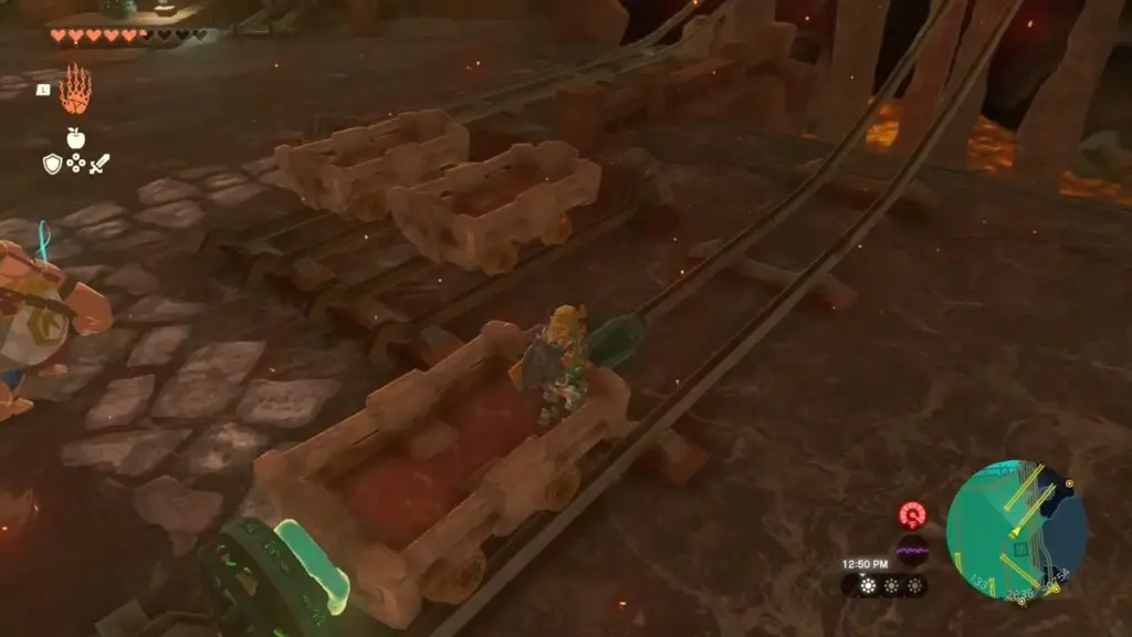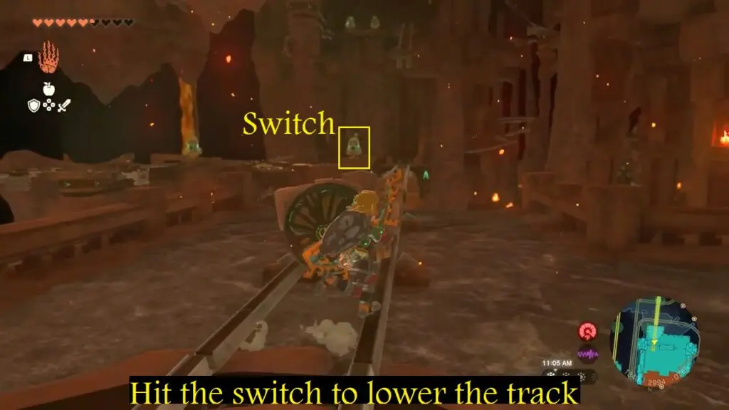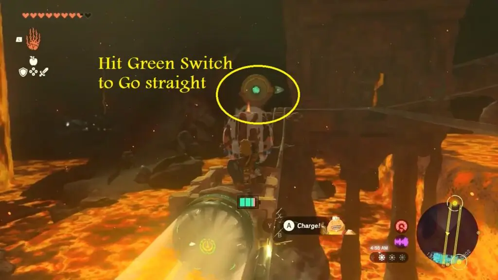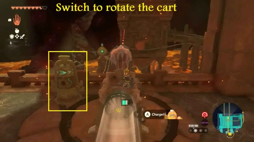 Utilize Yunobo’s Charge attack to hit the green switch sign directly ahead on the tracks. This will redirect the cart to the tracks on the right side.