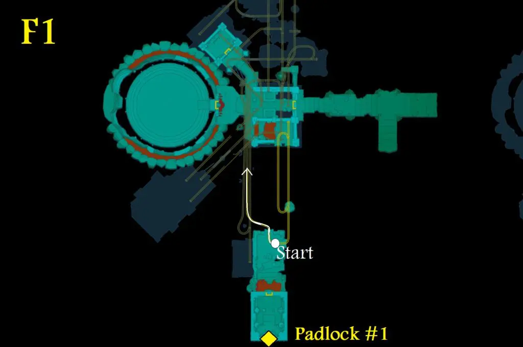 Ride the cart of the western track to reach the F5 level. The padlock is at F1 of the same tower.