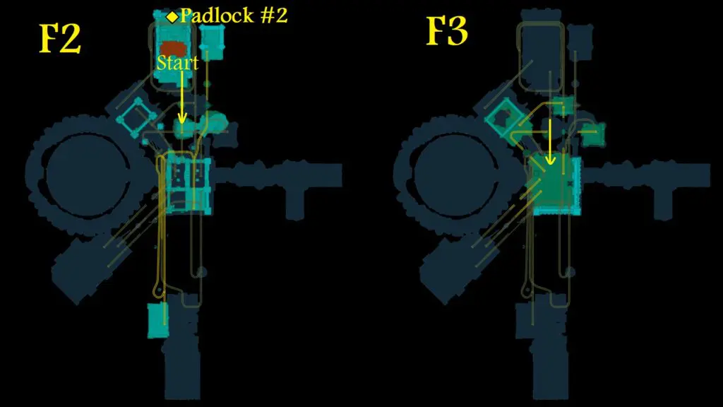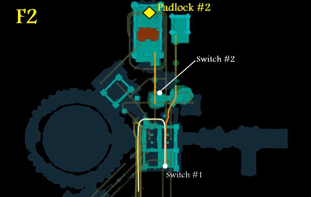 Within the room where you discover Padlock #2 on level F2, put the cart on the track. Hit the switch on the other side of the gap to raise the tracks. Drive the cart to level F3.