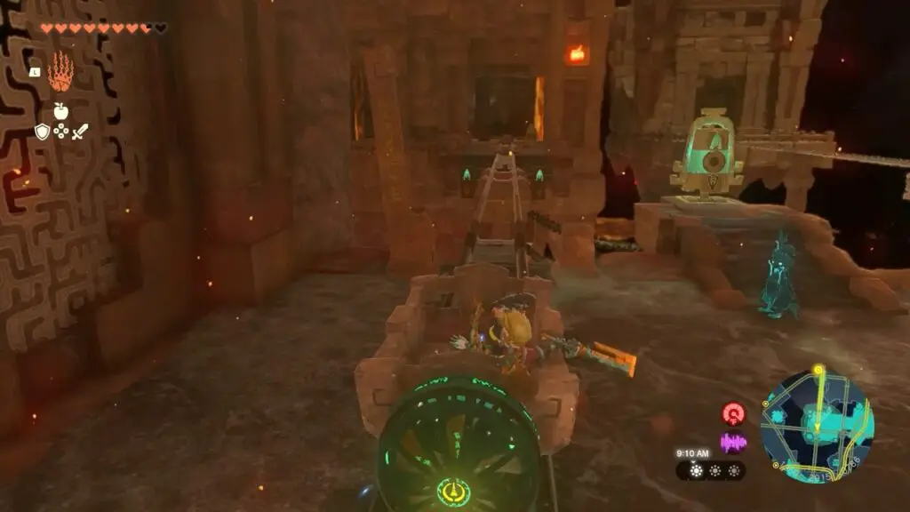 Use Ultrahand to place a cart on the tracks and activate the fan. While traveling along the rail line, launch Yunobo towards the green switch sign to alter the track’s direction.