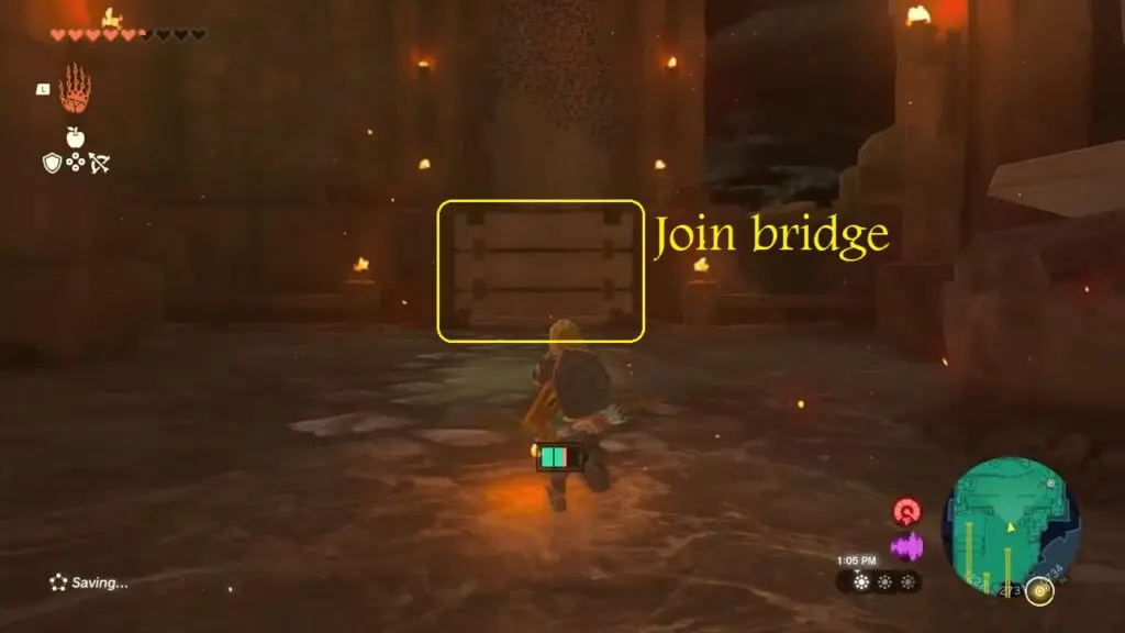 Upon reaching F4, join the bridge and utilize Yunobo’s Charge attack to propel it upwards. Yunobo will go up the floor, demolishing rocks in the process, and a box will descend.