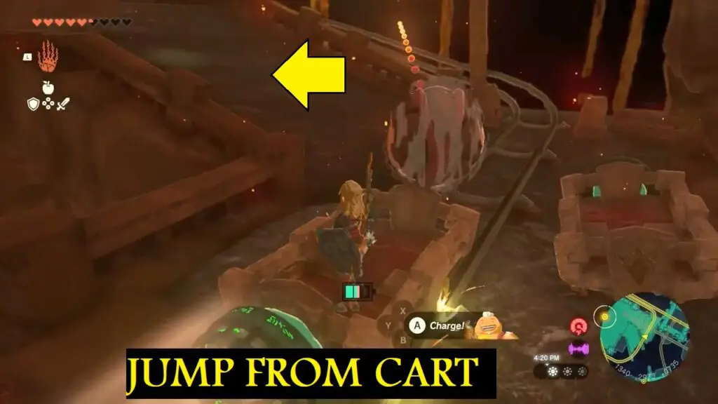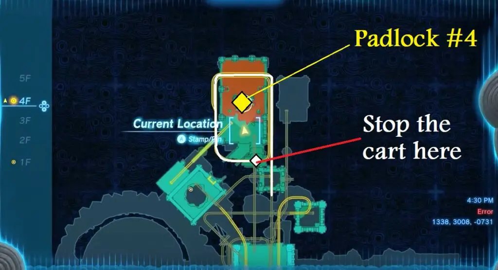 Position this modified cart onto the partially broken tracks located on the right side, specifically the tracks that ascend and head southwest according to the map. Activate the rocket, which will provide a boost, propelling you over the damaged section of the track and onto the 4th floor (F4).