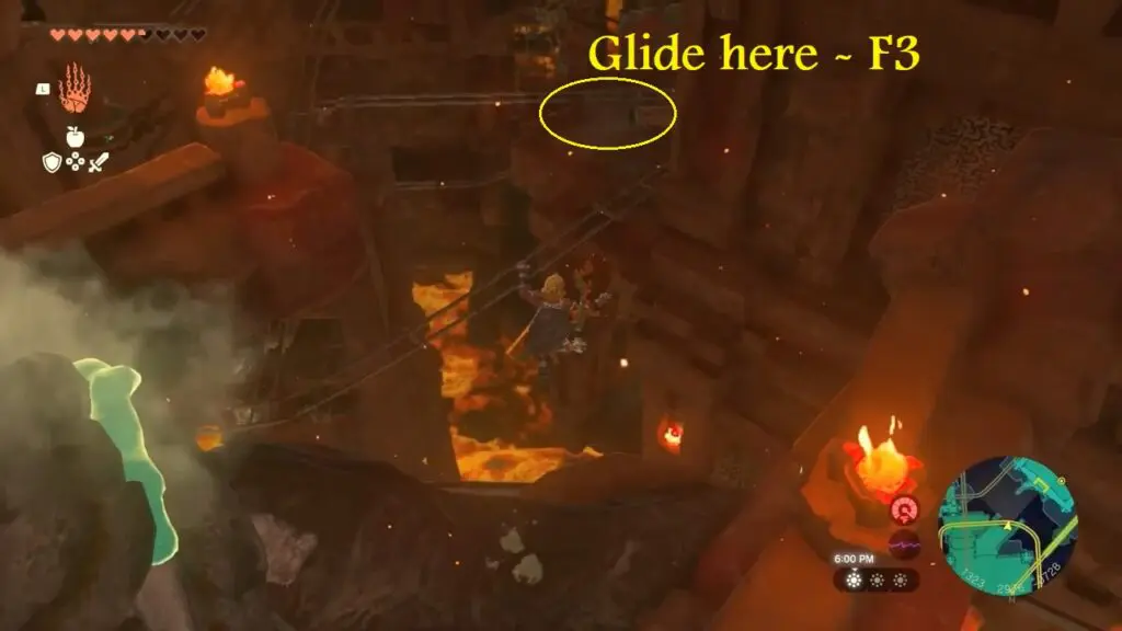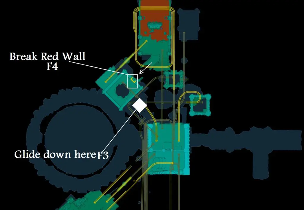 Jump and glide down to enter the F4 level (through the same opening that you created earlier).
