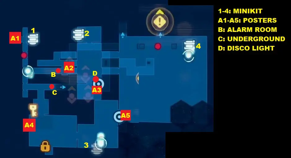 Poster A2: To reach this poster, you need to go to the Alarm Room. To enter the Alarm room, go to the location marked as ‘B’ on the map. Use the Villain Terminal there to enter the Alarm Room. Deactivate the alarm inside the room and then pull down the ladder as shown in the picture below. Climb the ladder to reach the upper level, where you will find the poster.